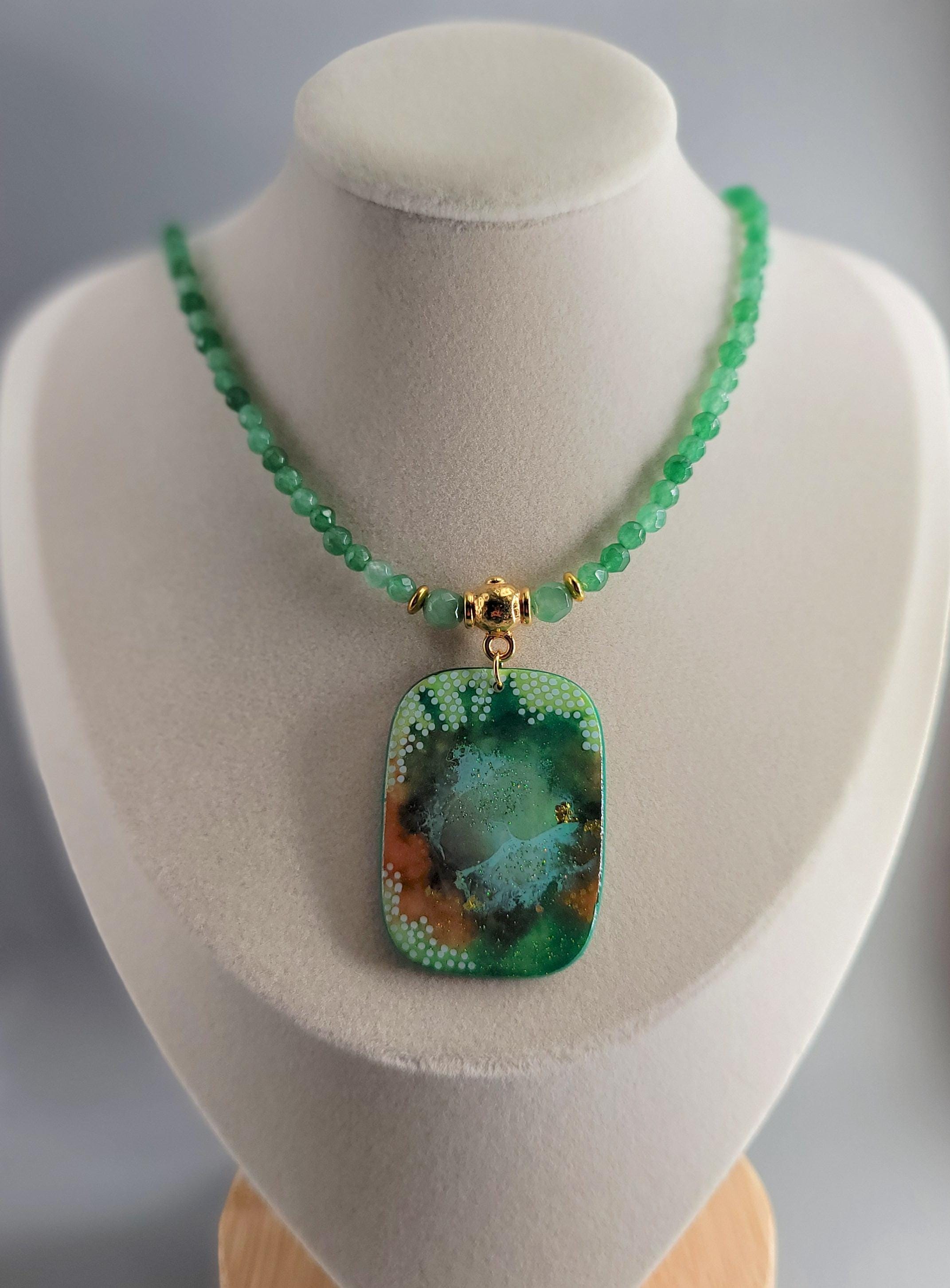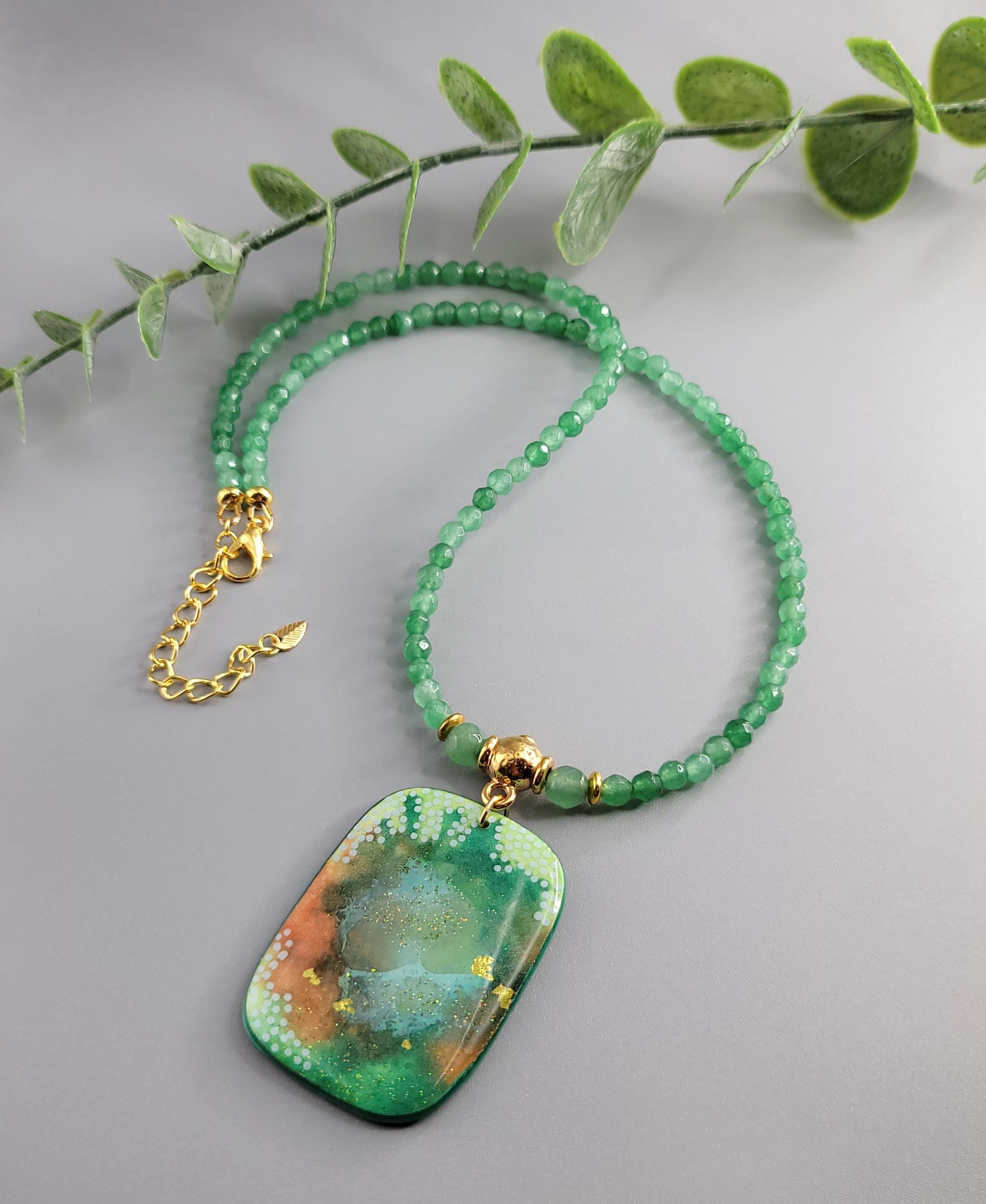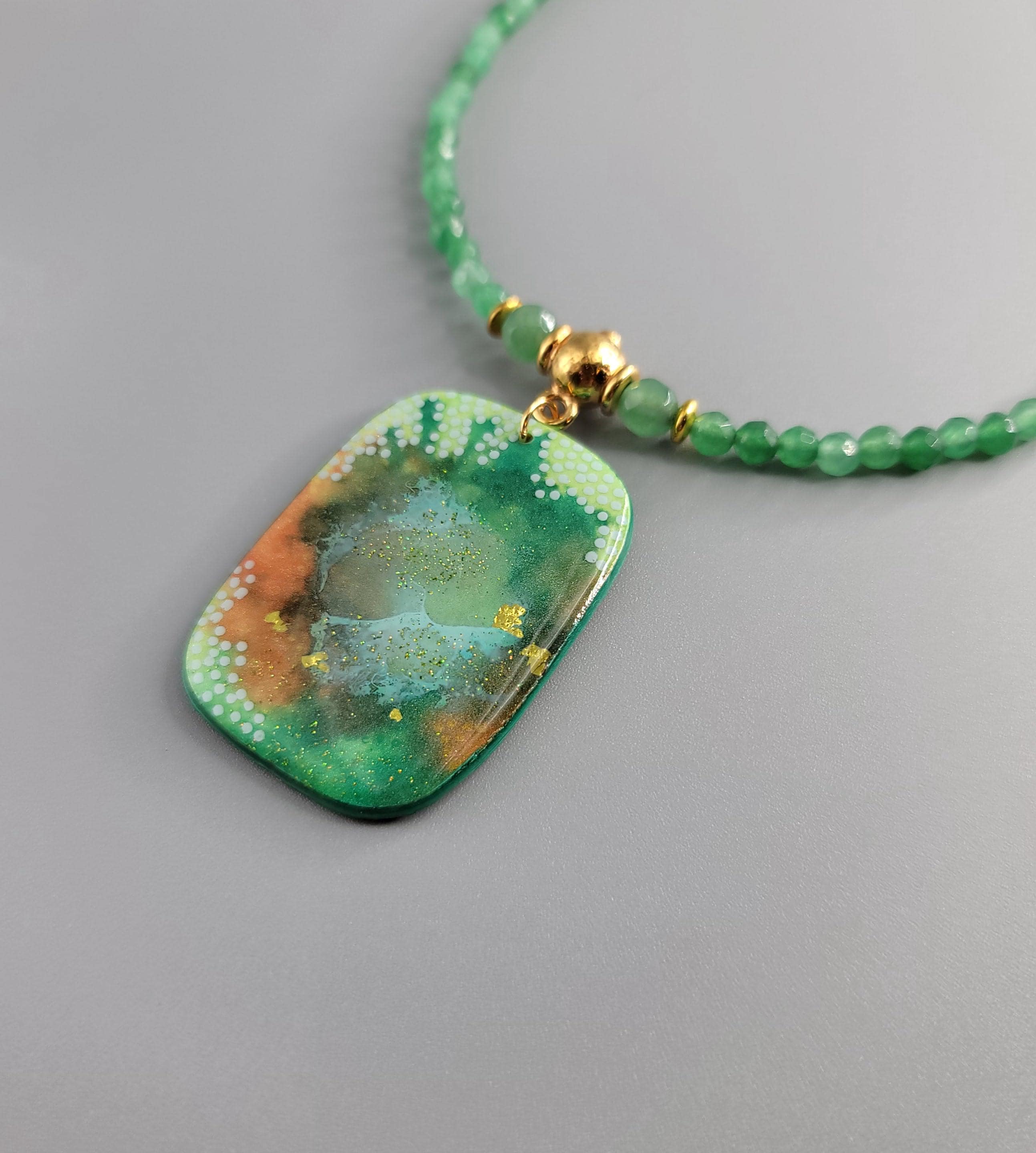 The background is created with alcohol inks, mixing the colors and creating different shapes highlighted with hand-painted dots. The front and back of the pendant are coated with UV resin and glitter.