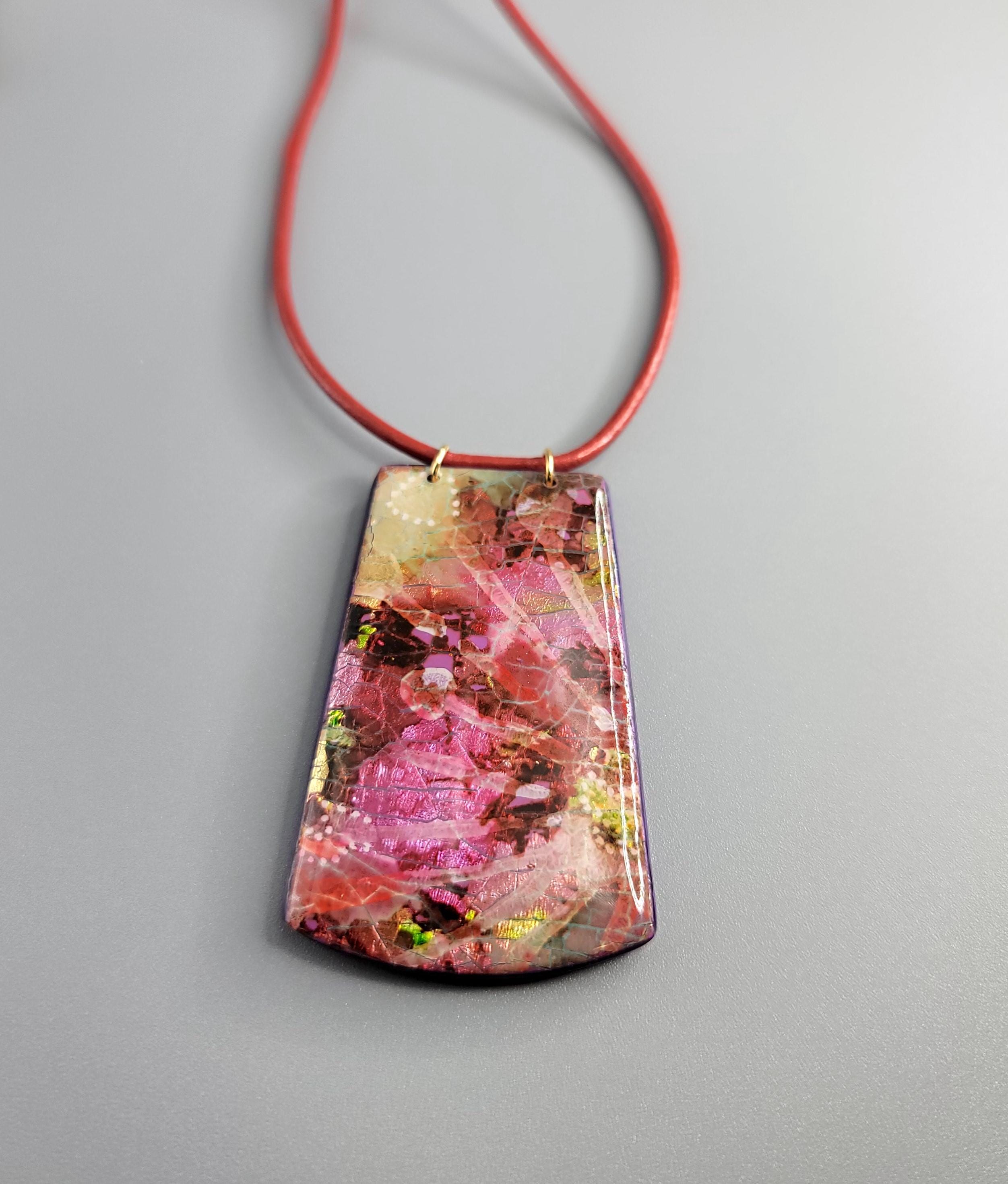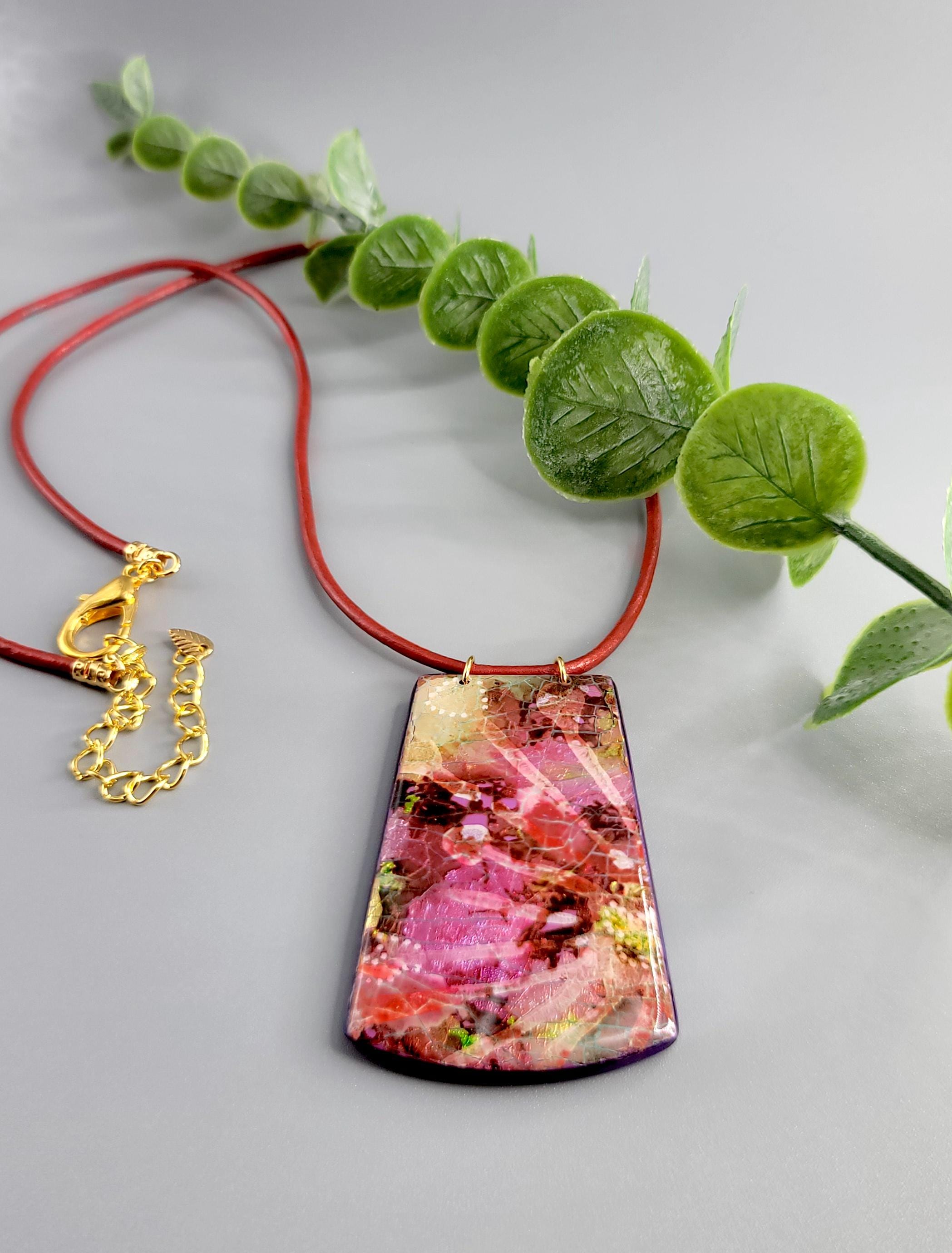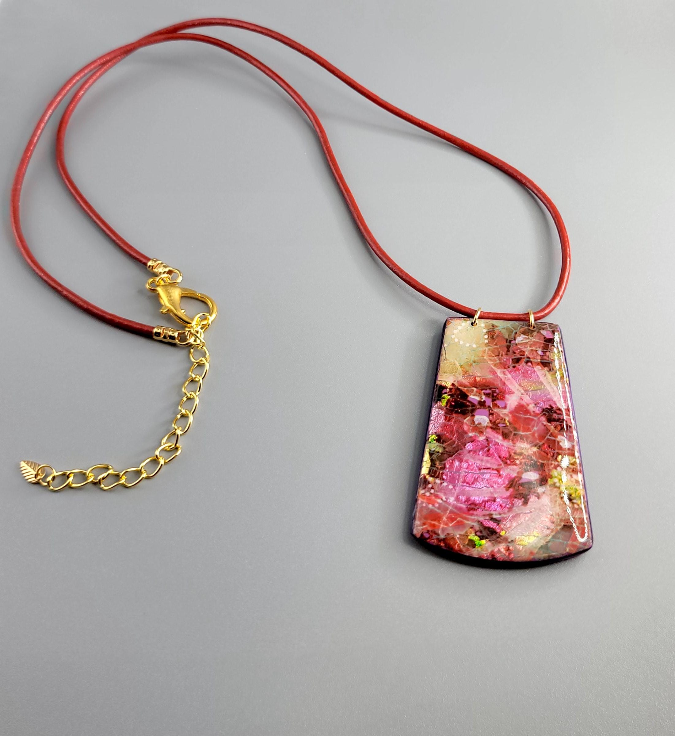 Polymer clay, alcohol ink, acrylic paint, metal sheet, metallic paint, UV resin, and leather cord.