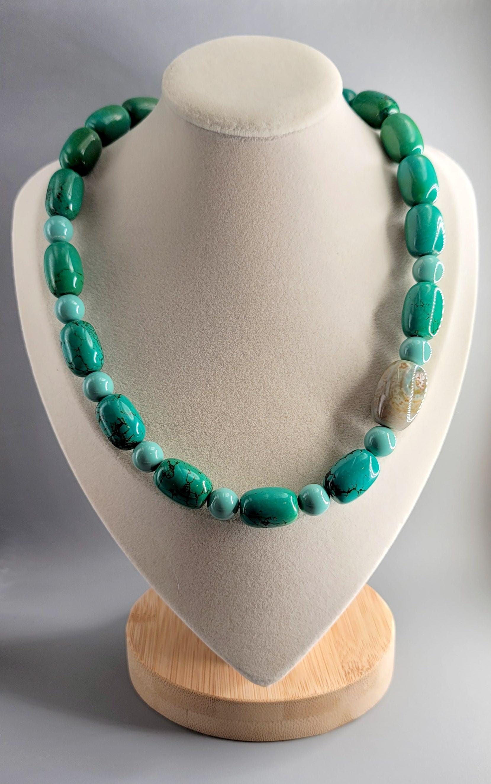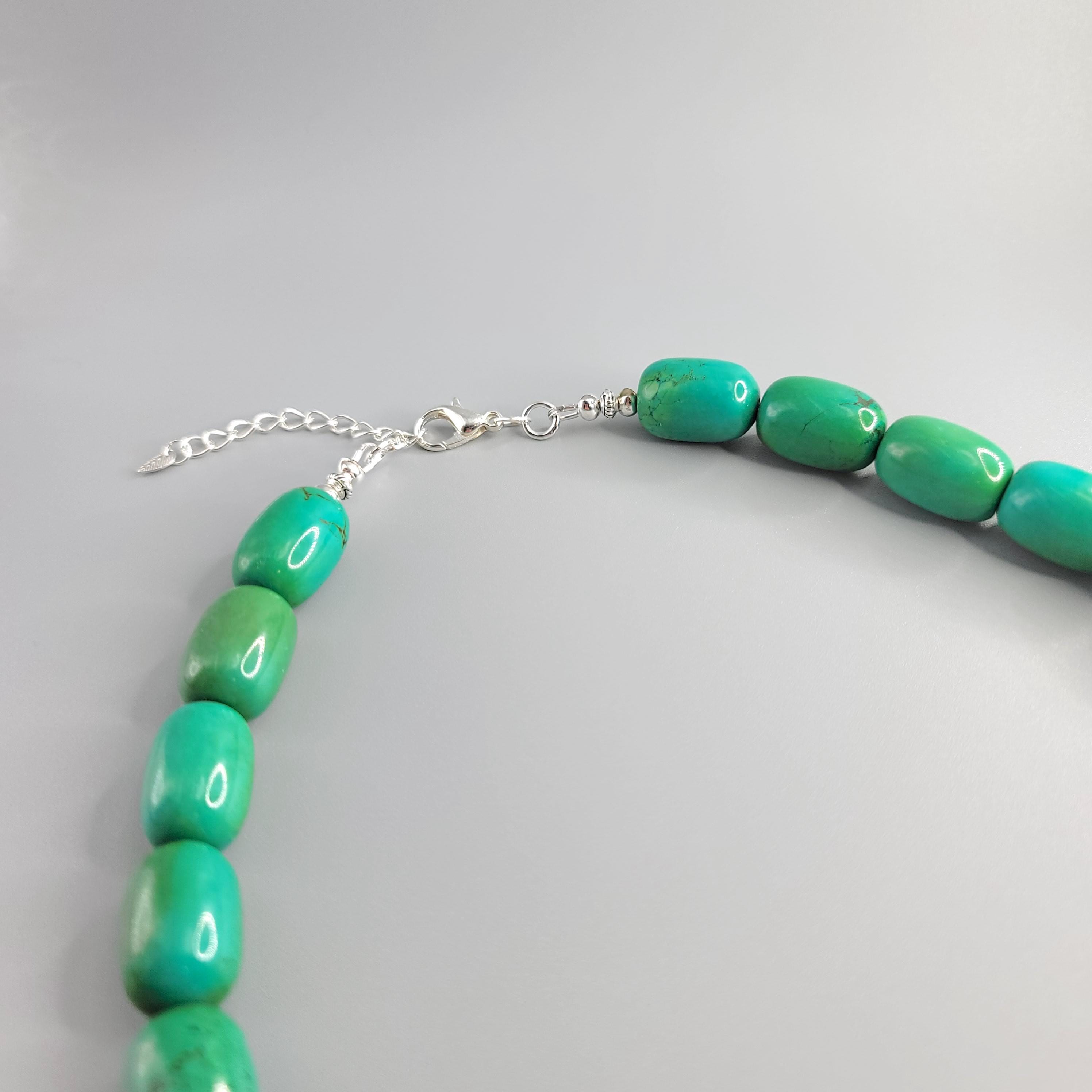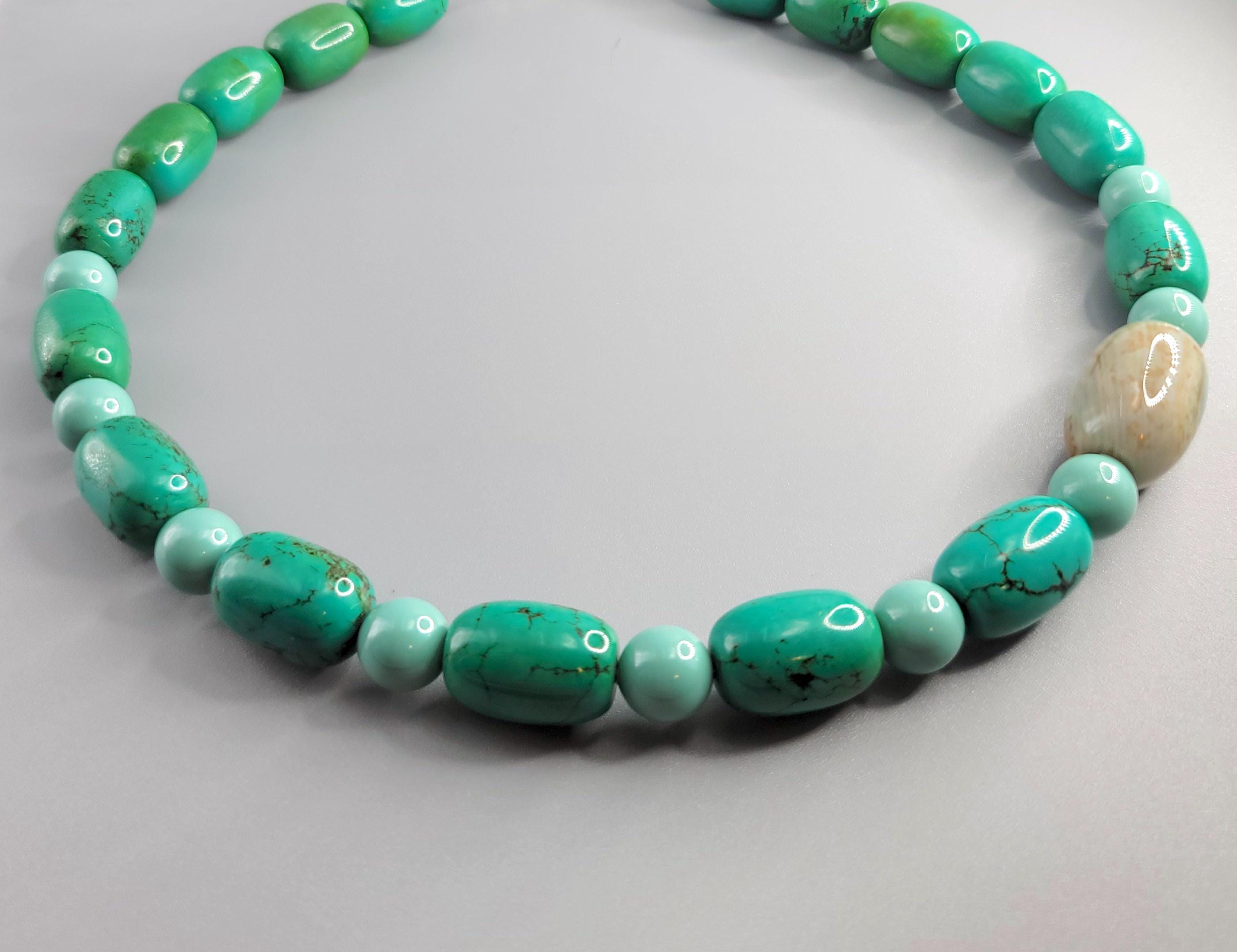 This necklace features Green Turquoise barrel beads and Fire Agate focal bead.