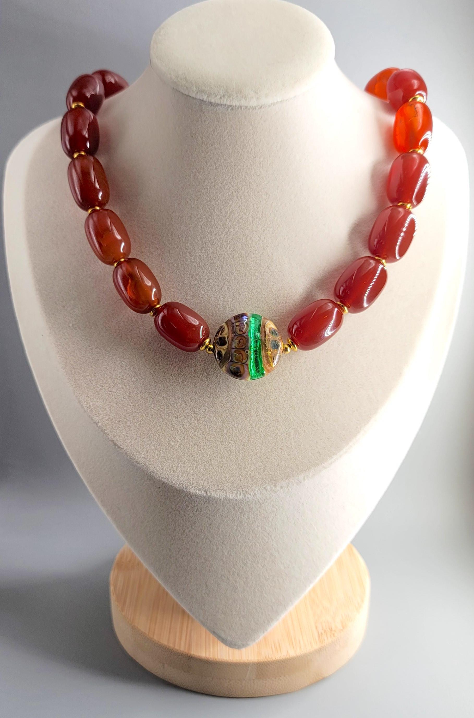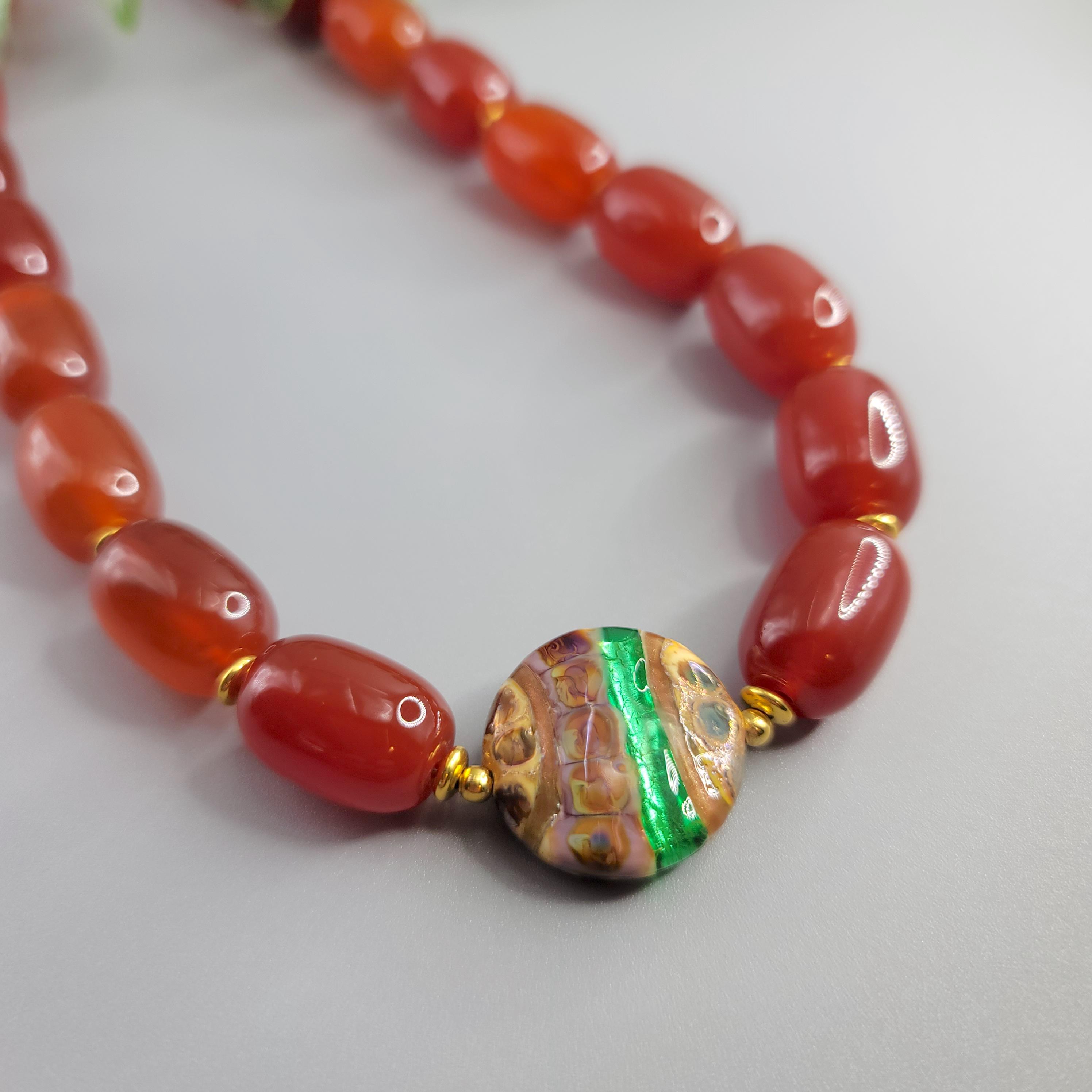 This necklace features lampwork focal bead, red agate barrel beads and gold plated spacers.