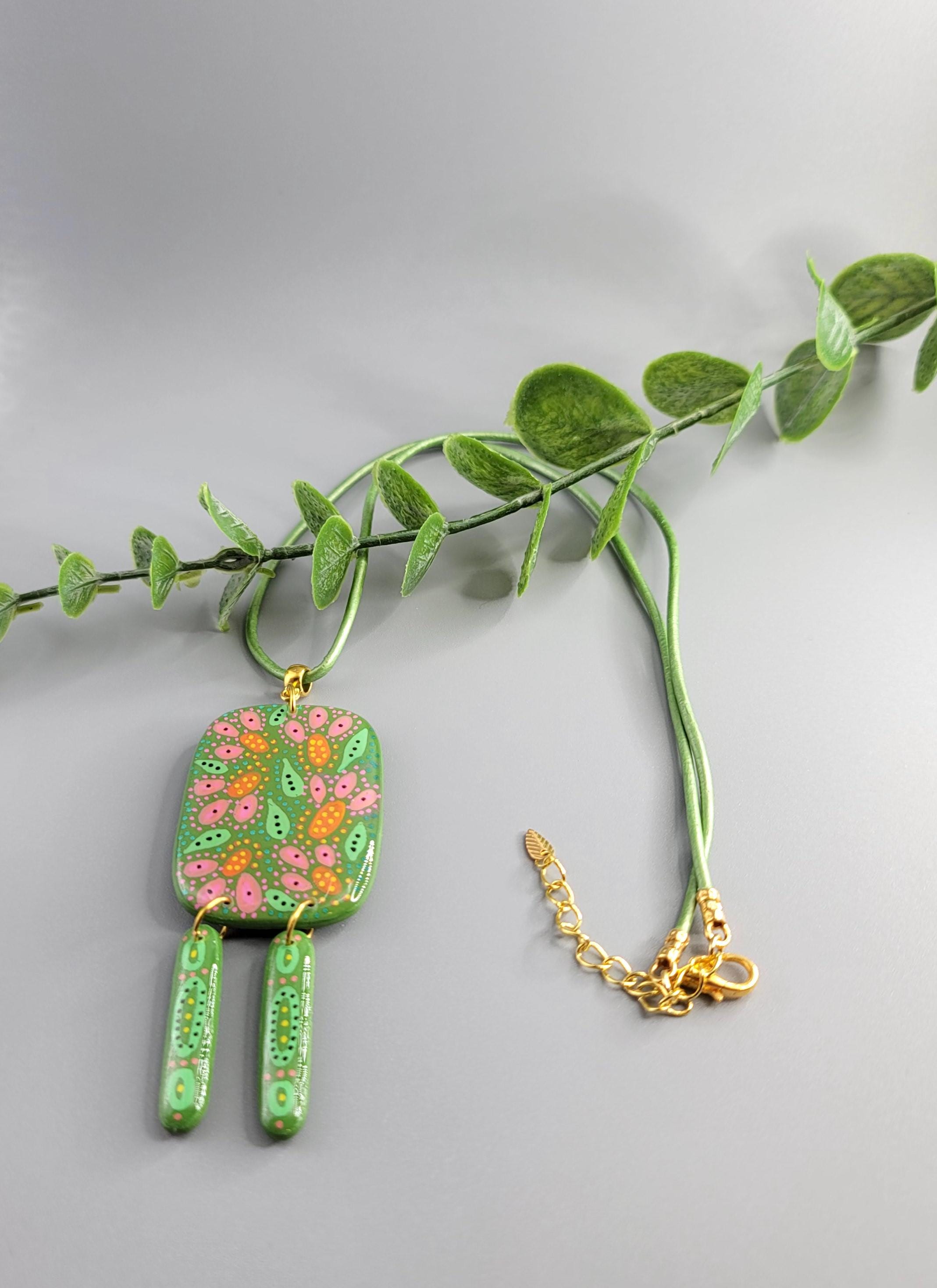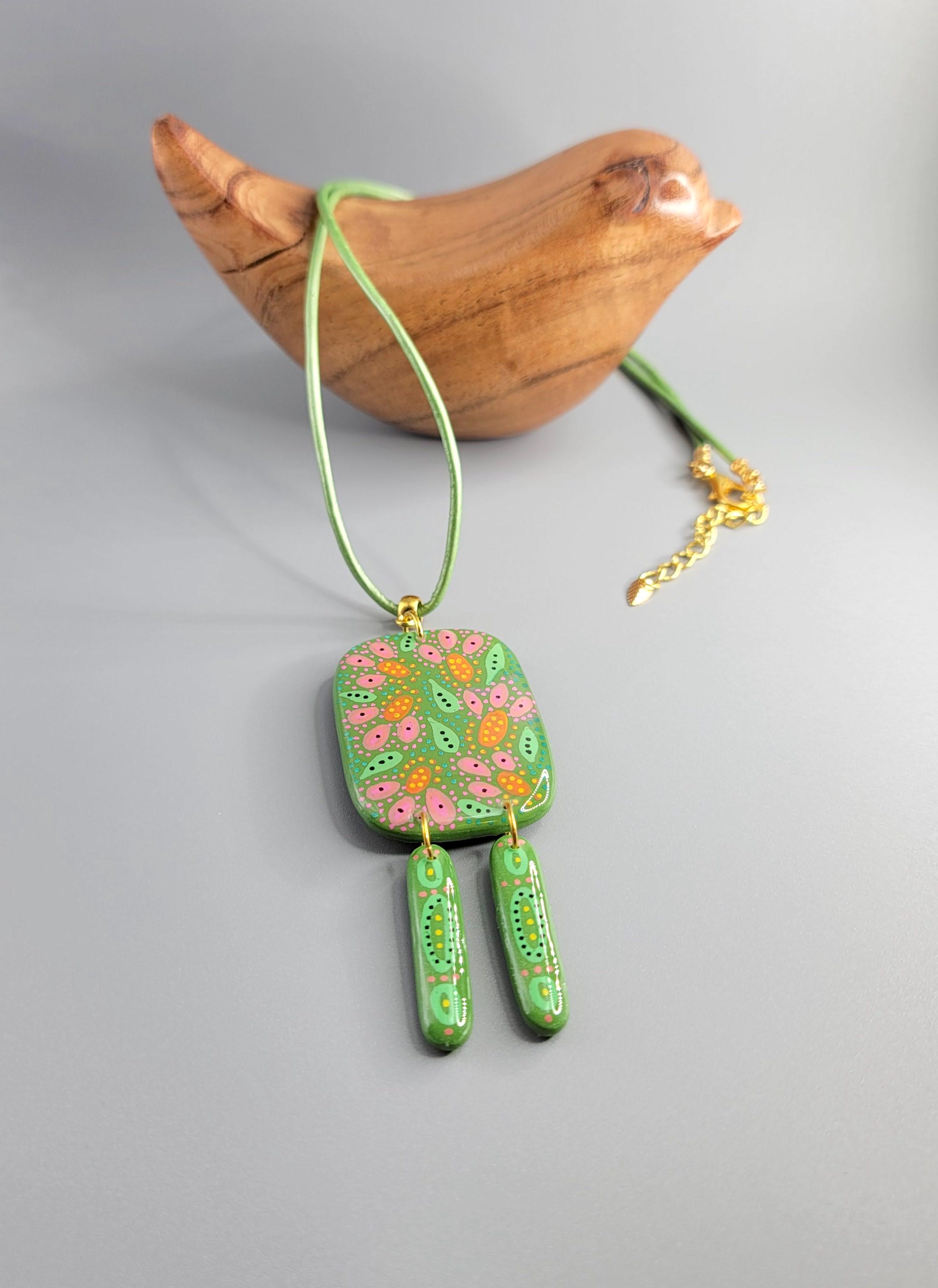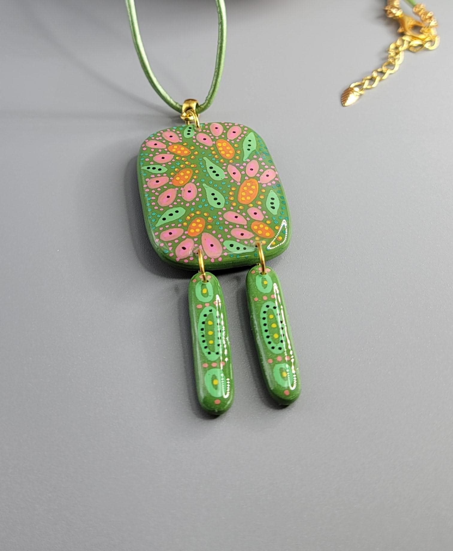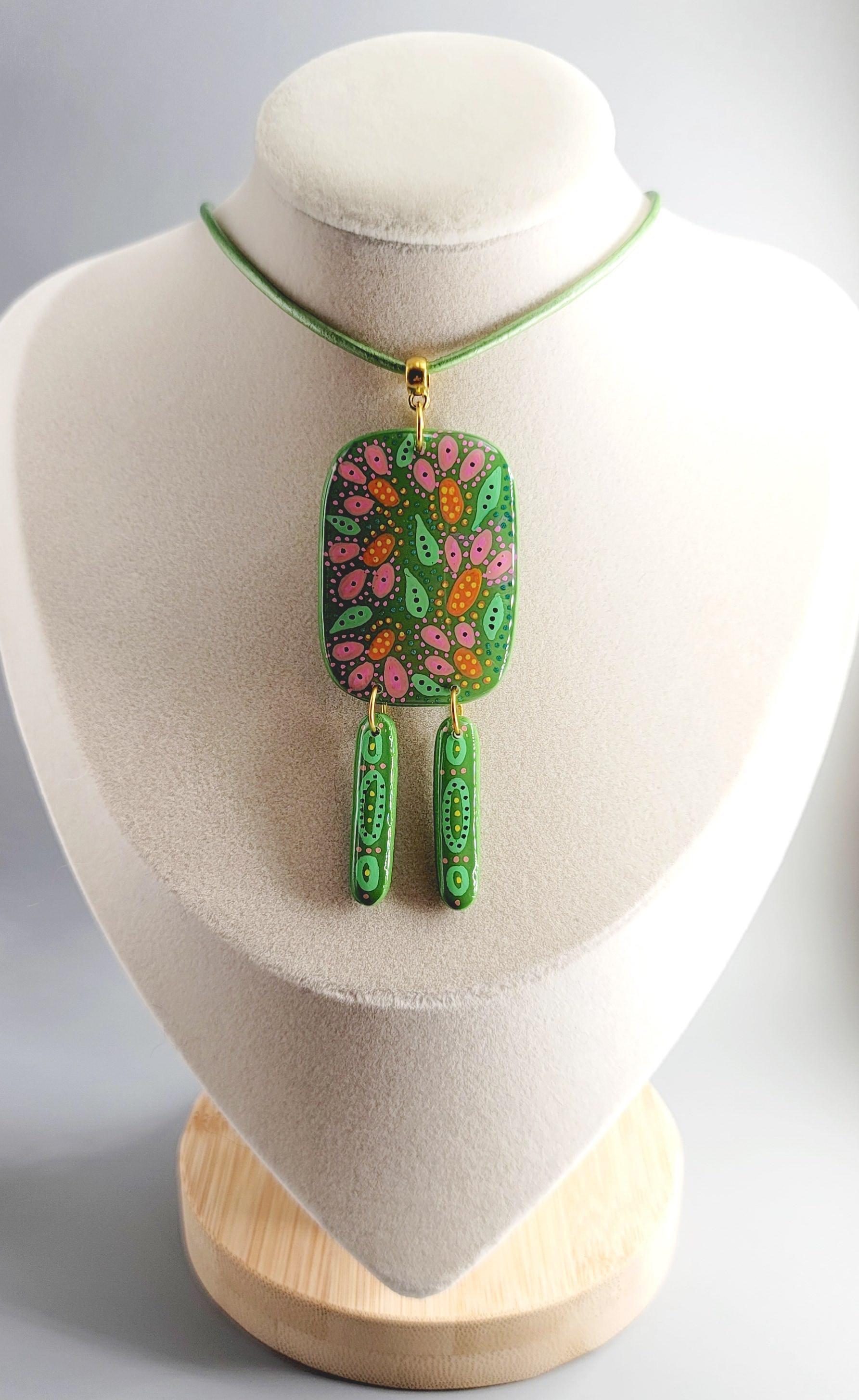 Polymer clay, acrylic paint, leather cord, gold plated, and UV resin.