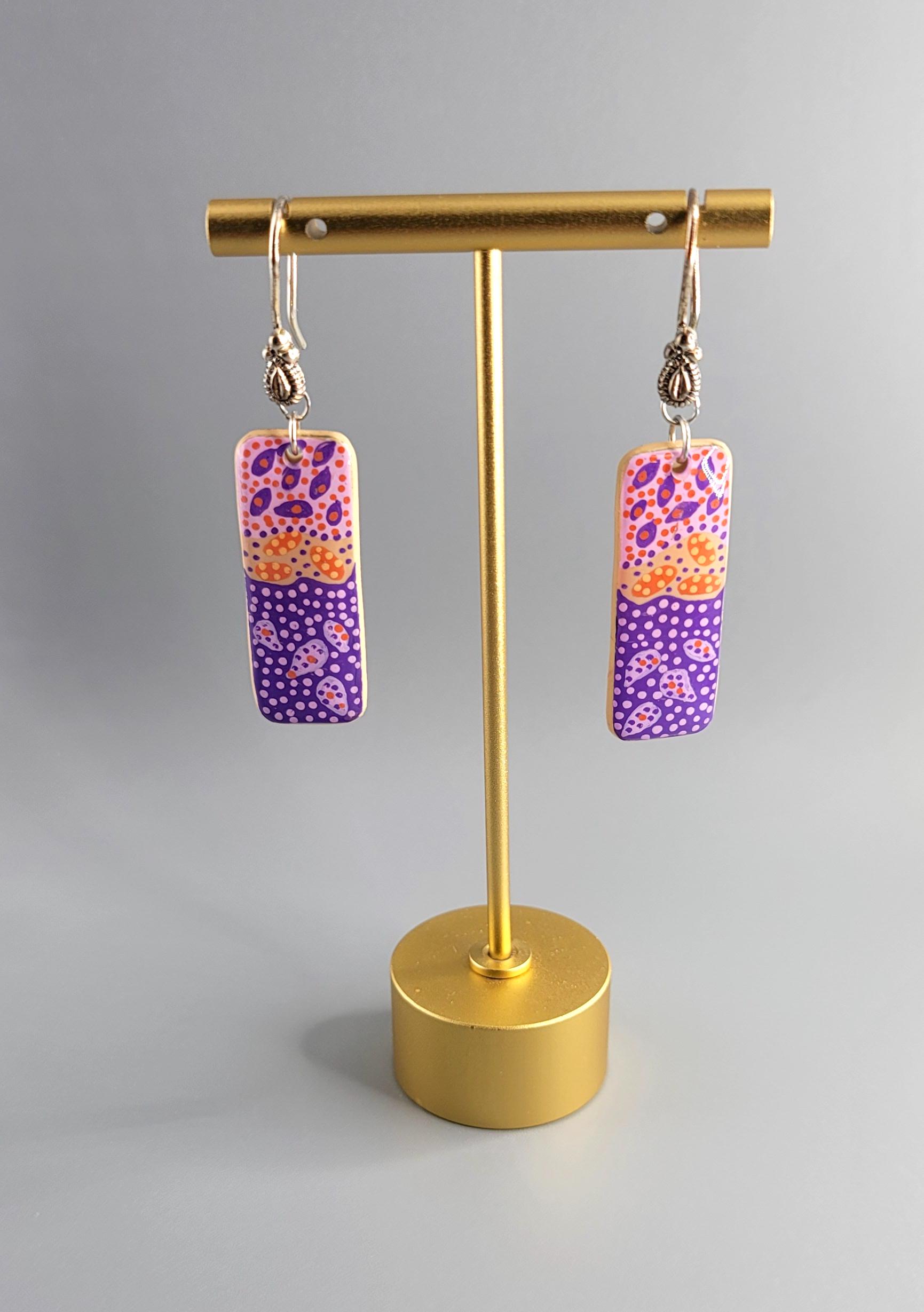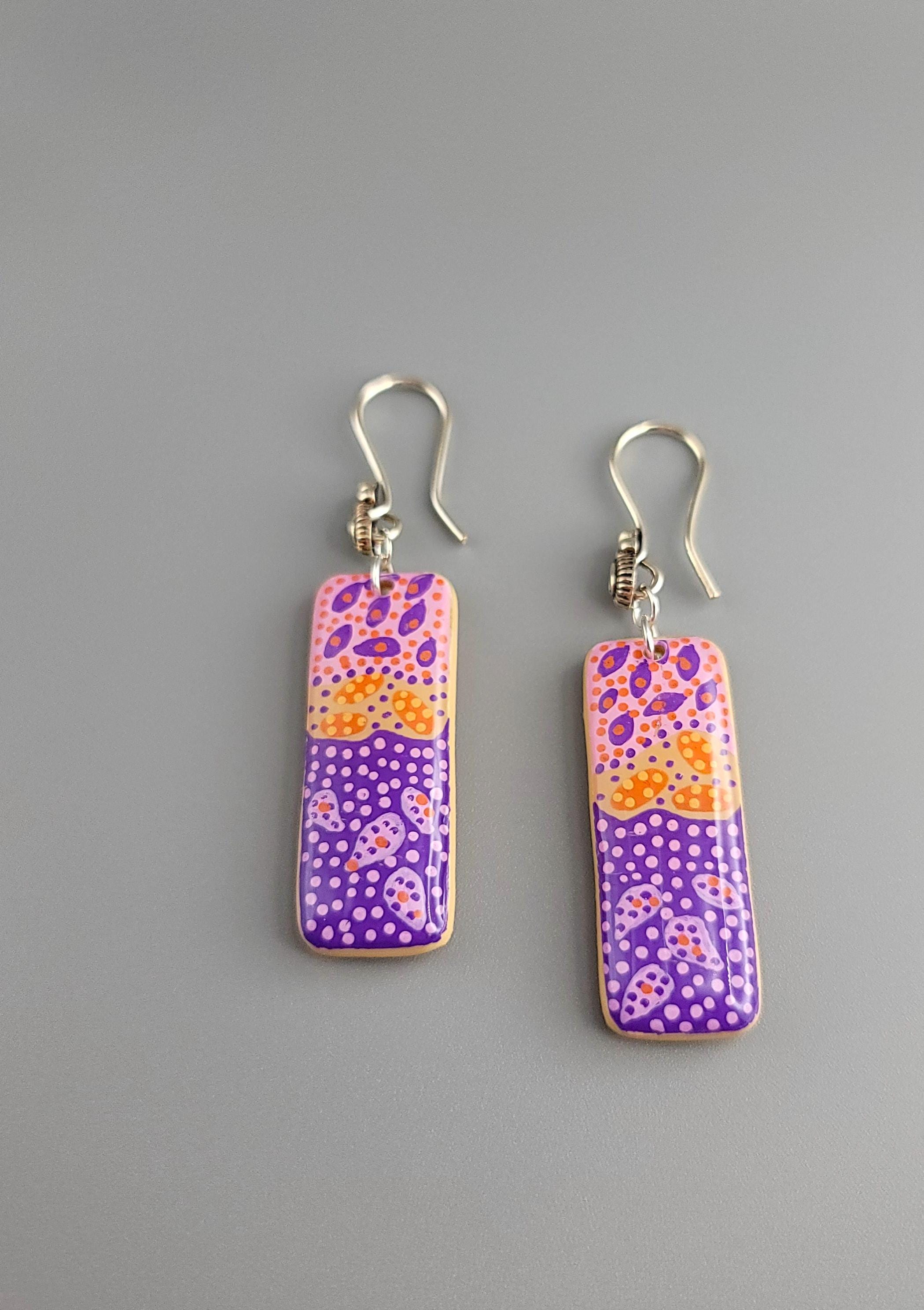 The earrings are crafted using Polymer Clay, different colors of acrylic paints. Both sides of the earrings are coated with UV resin.