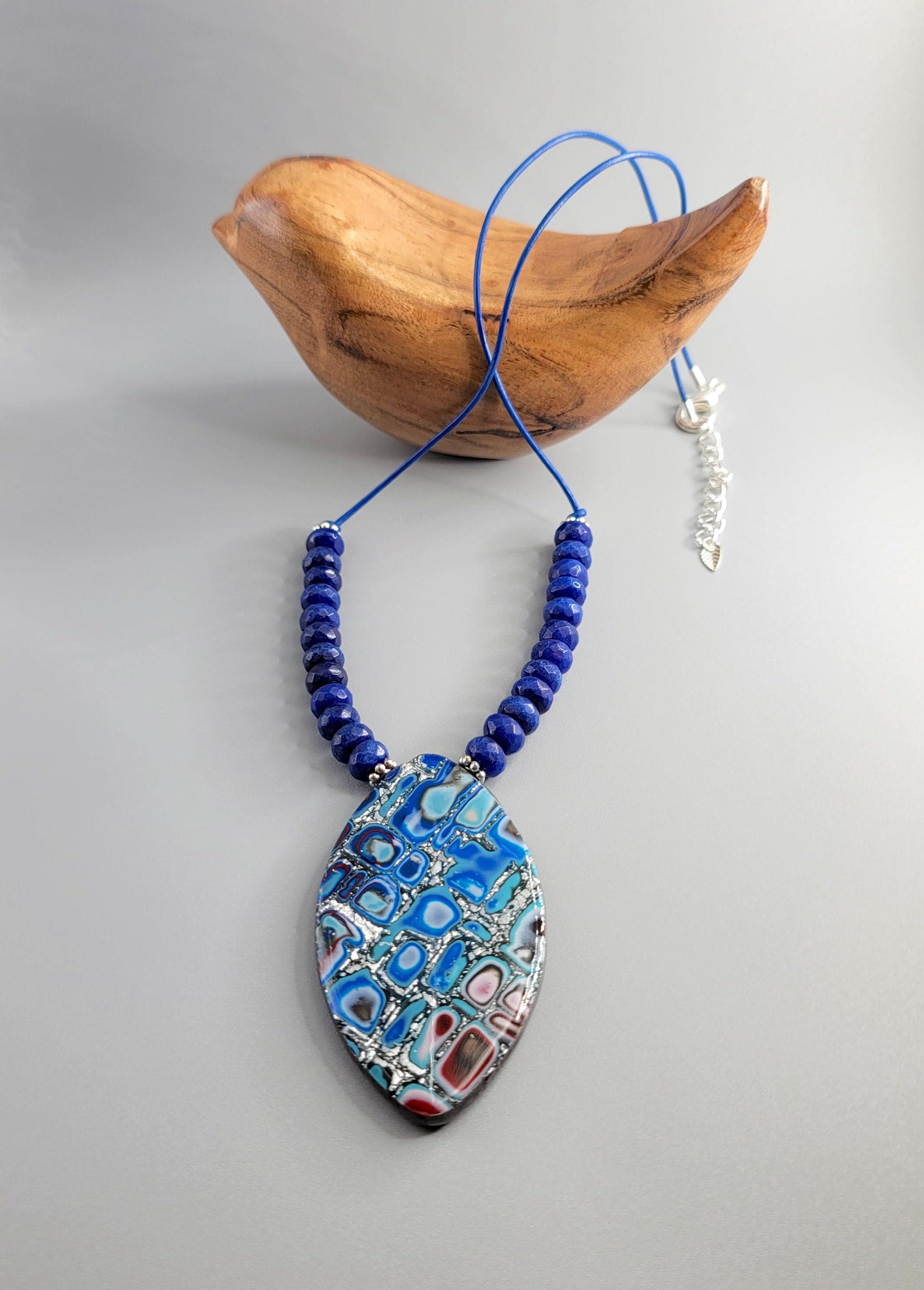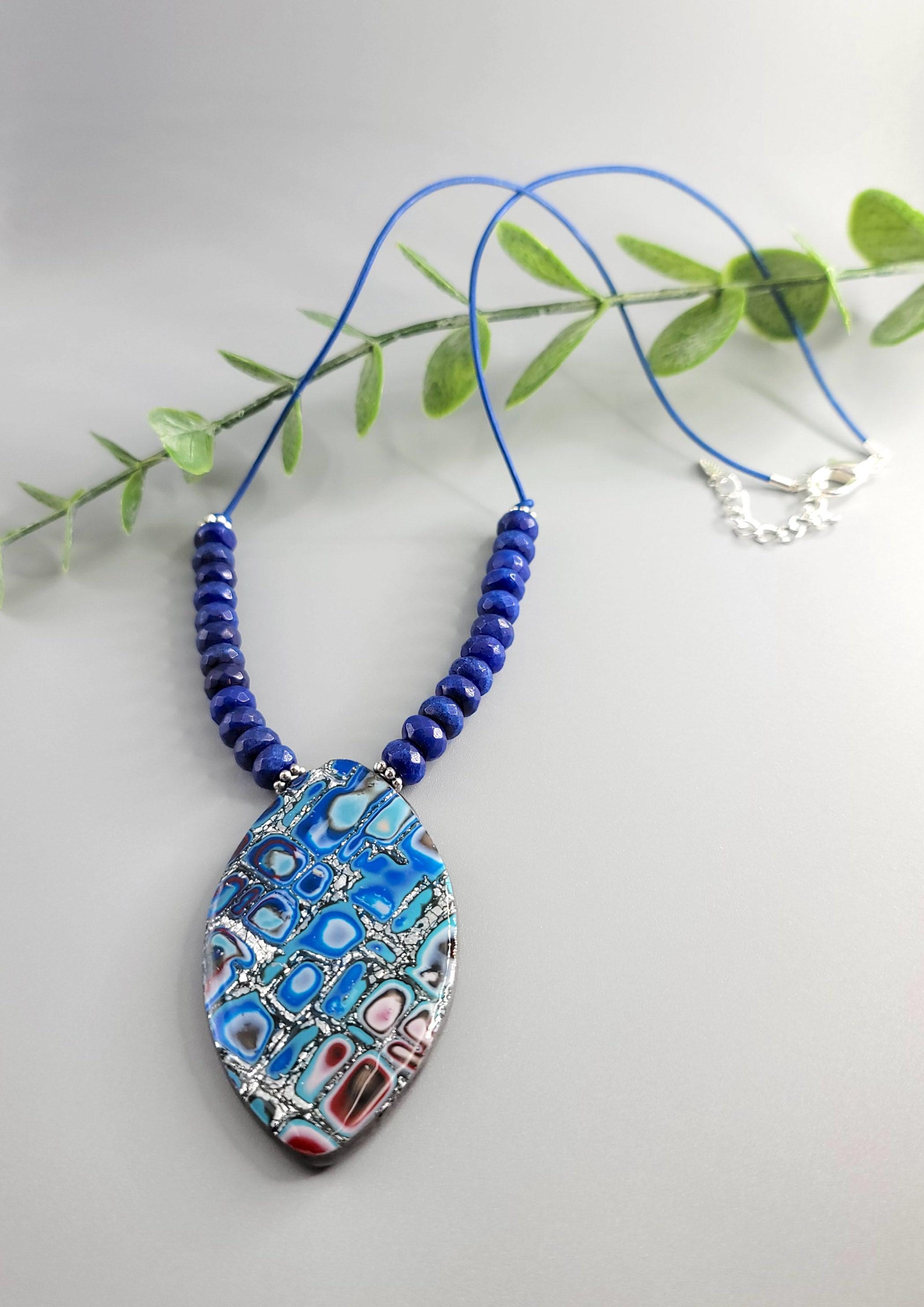 Polymer clay, UV resin, gemstones, leather cord, antique silver spacers and UV resin.