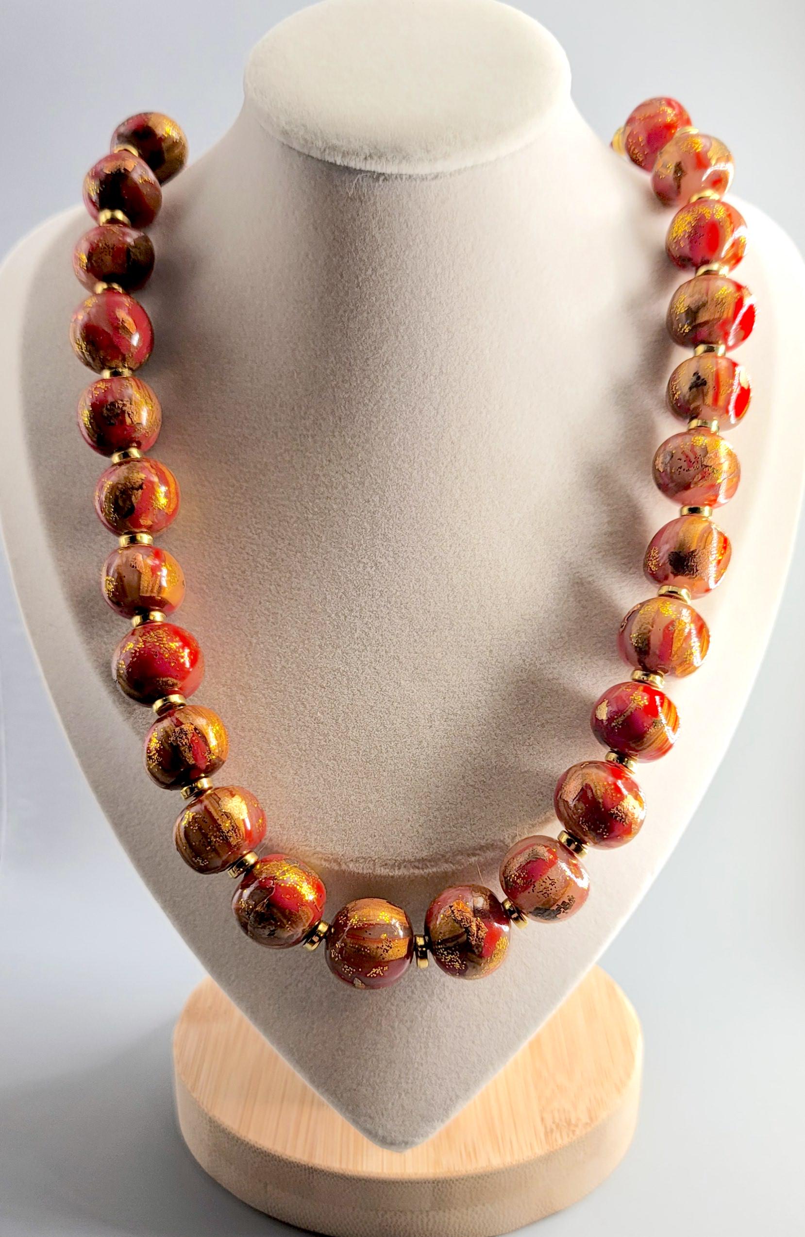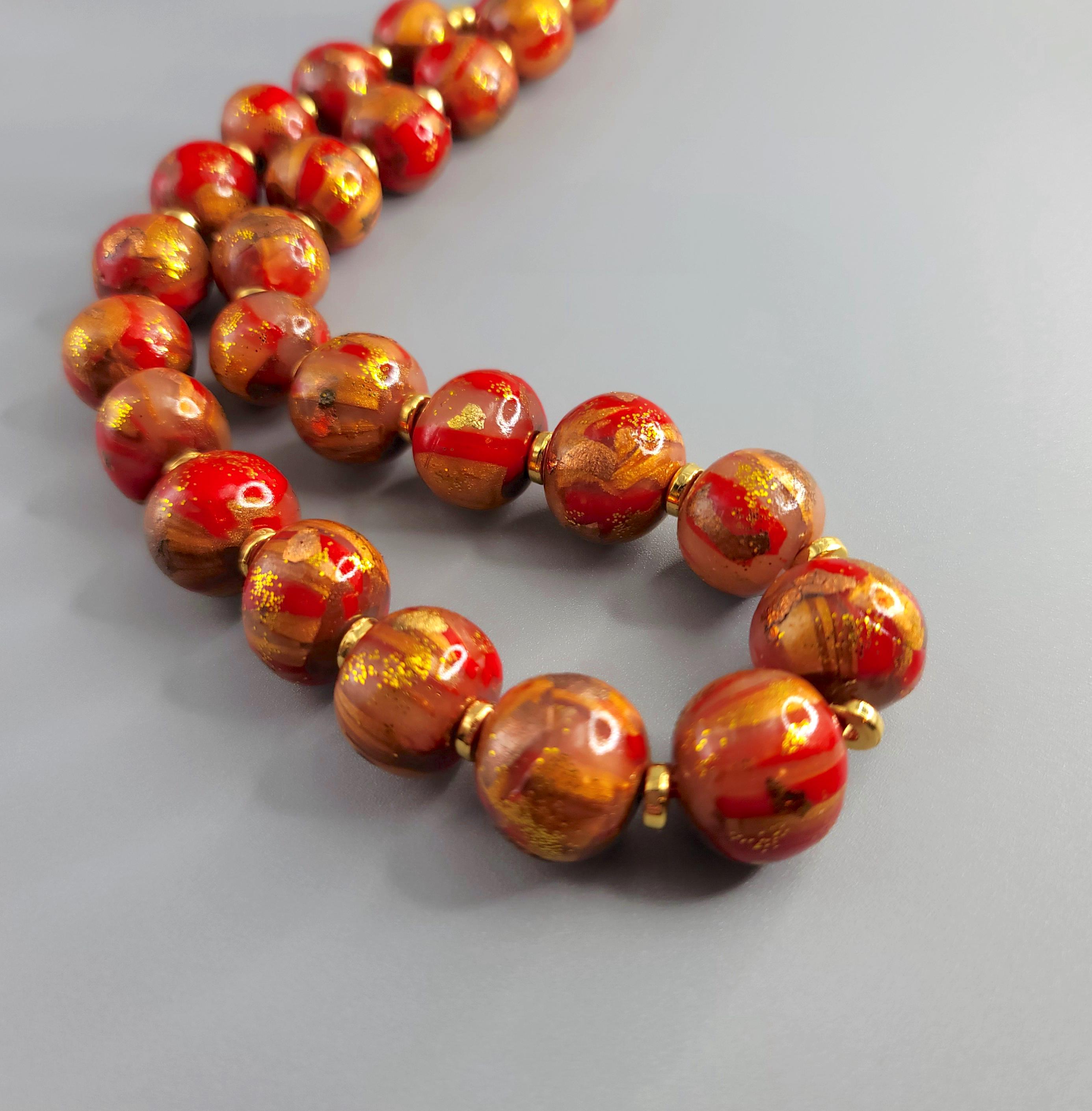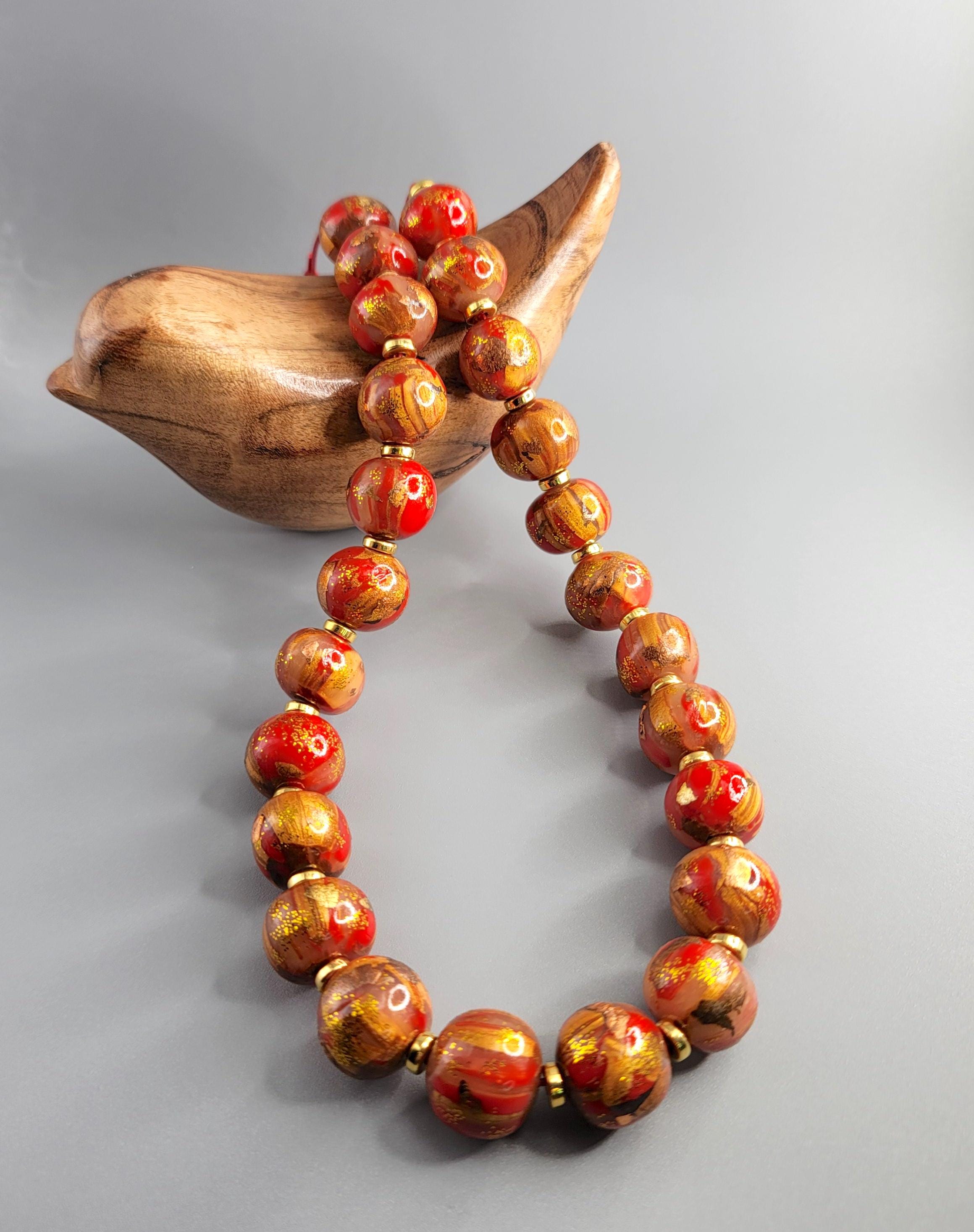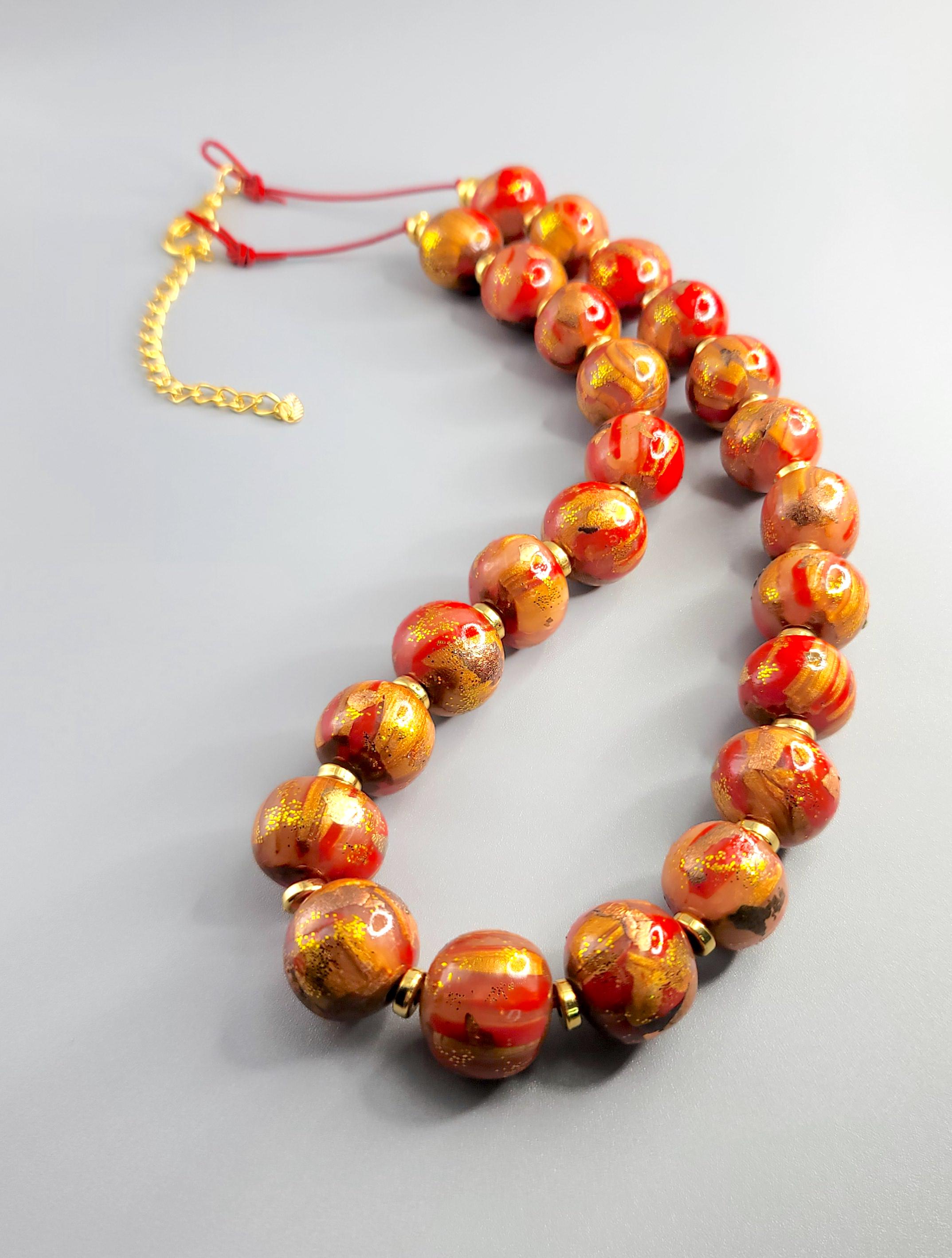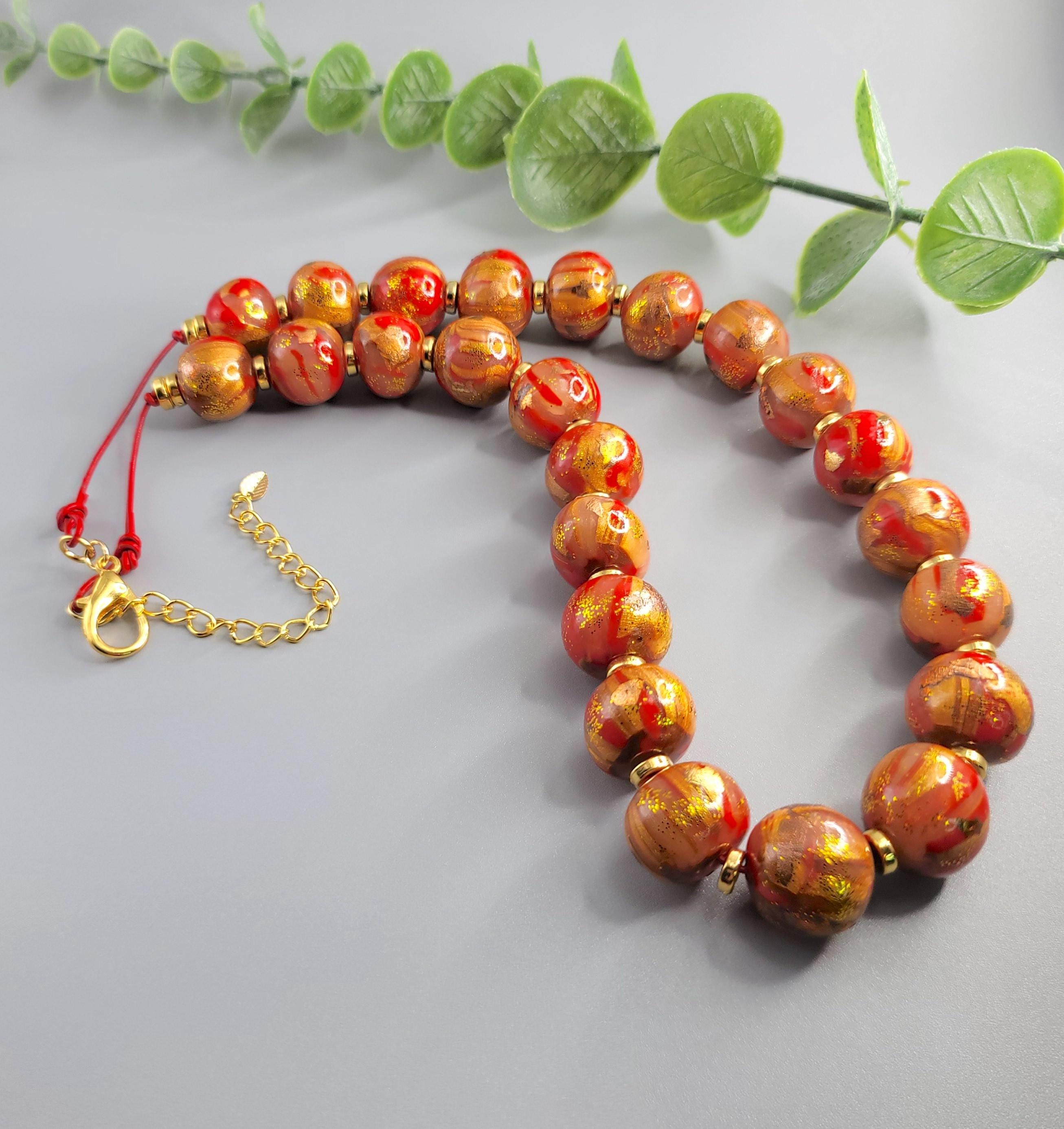 The necklace is crafted using Polymer Clay, and metal sheets. The beads are round organic form and are coated with a gloss clear polyurethane.