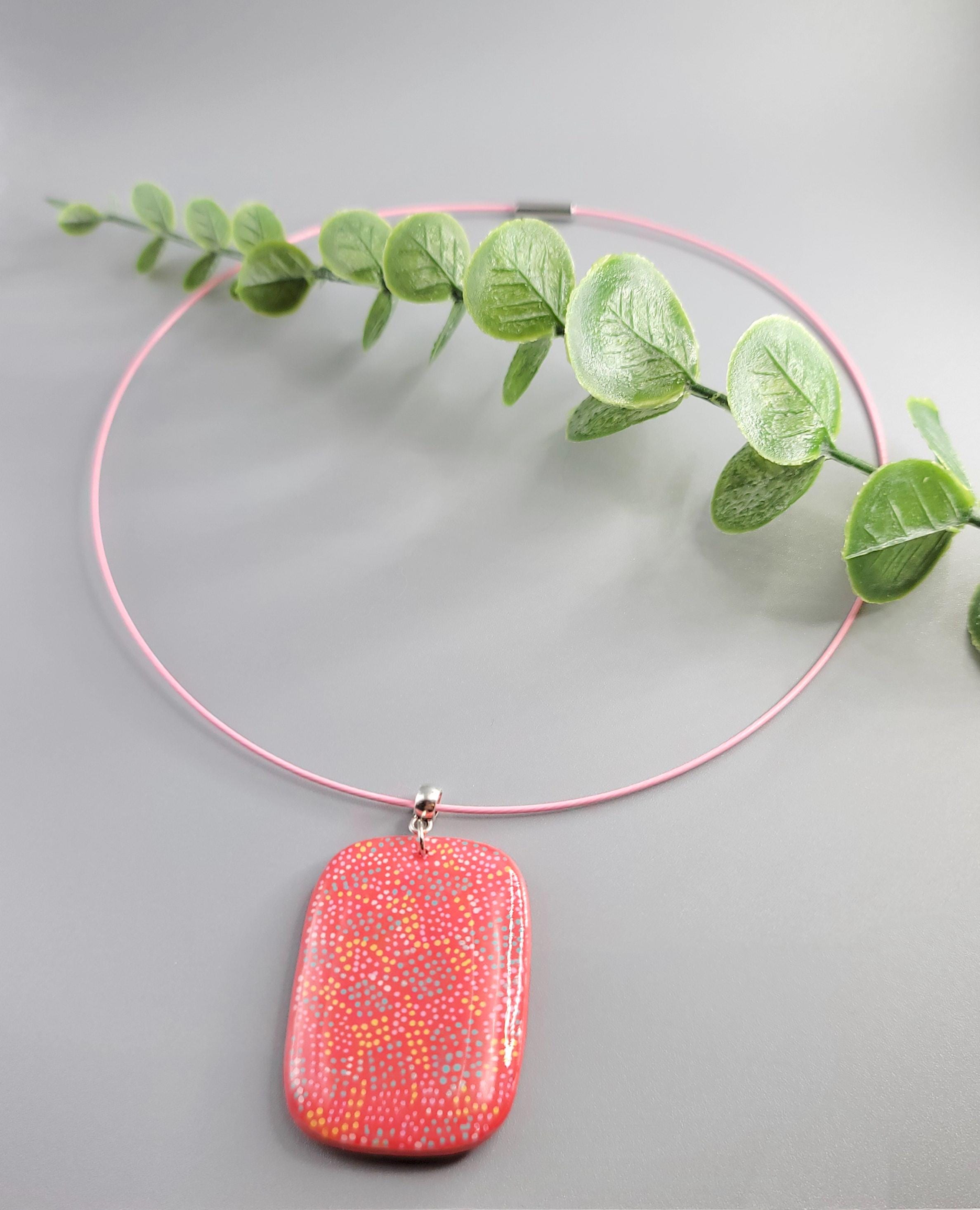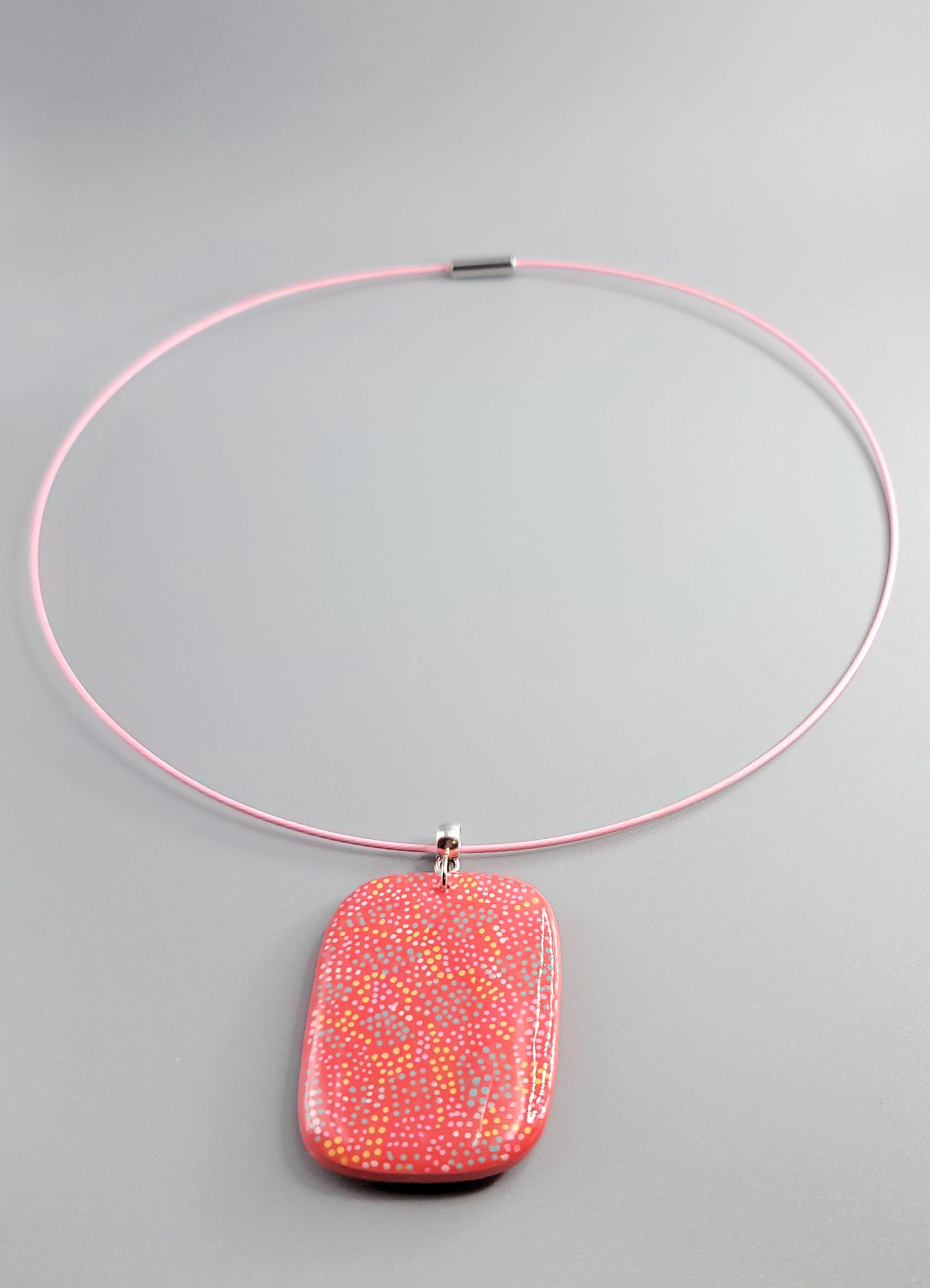 Polymer clay, alcohol ink, acrylic paint, UV resin, and stainless steel cord.