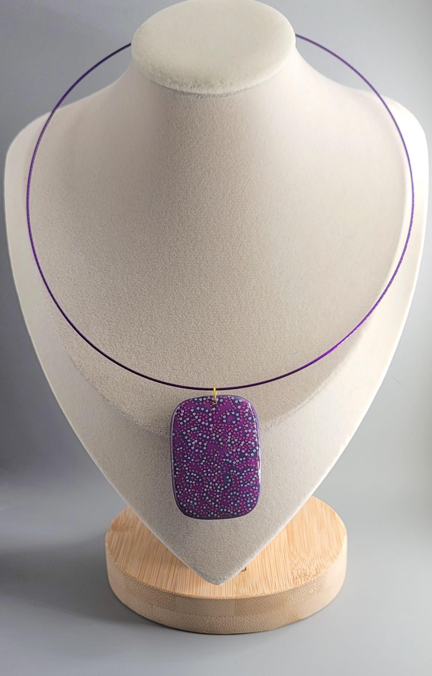 The pendant is crafted using Polymer Clay, mica powders, acrylic and metallic paint. The front, back and sides of the pendant are coated with UV resin.