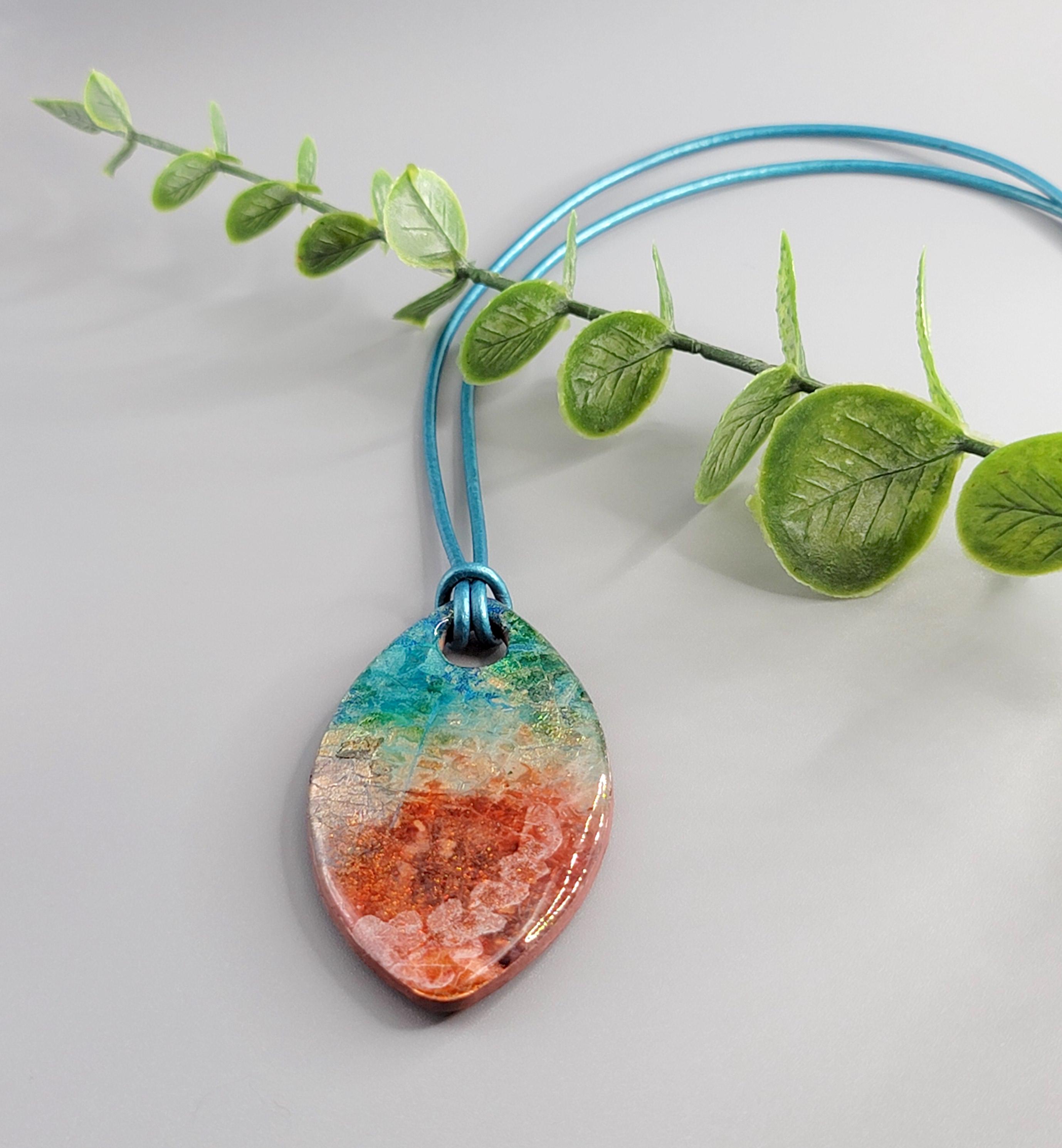 The pendant is crafted using Polymer Clay, alcohol inks, metallic foil leaf, glitter, acrylic and metallic paint. Both sides of the pendant are coated with UV resin.