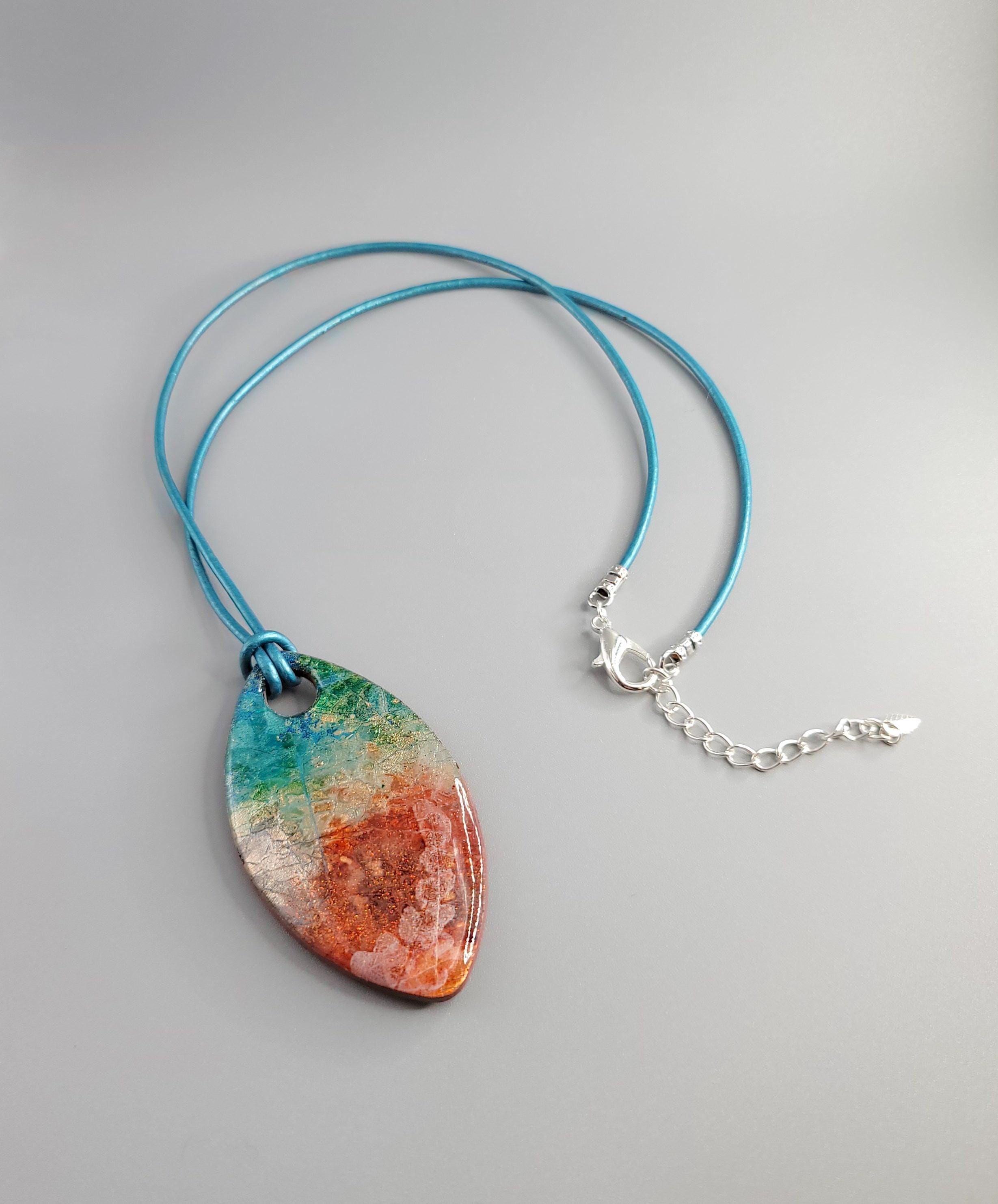 Polymer clay, alcohol inks, acrylic paint, metallic foil leaf, metallic paint, glitter, UV resin, silver plated, and leather cord.
