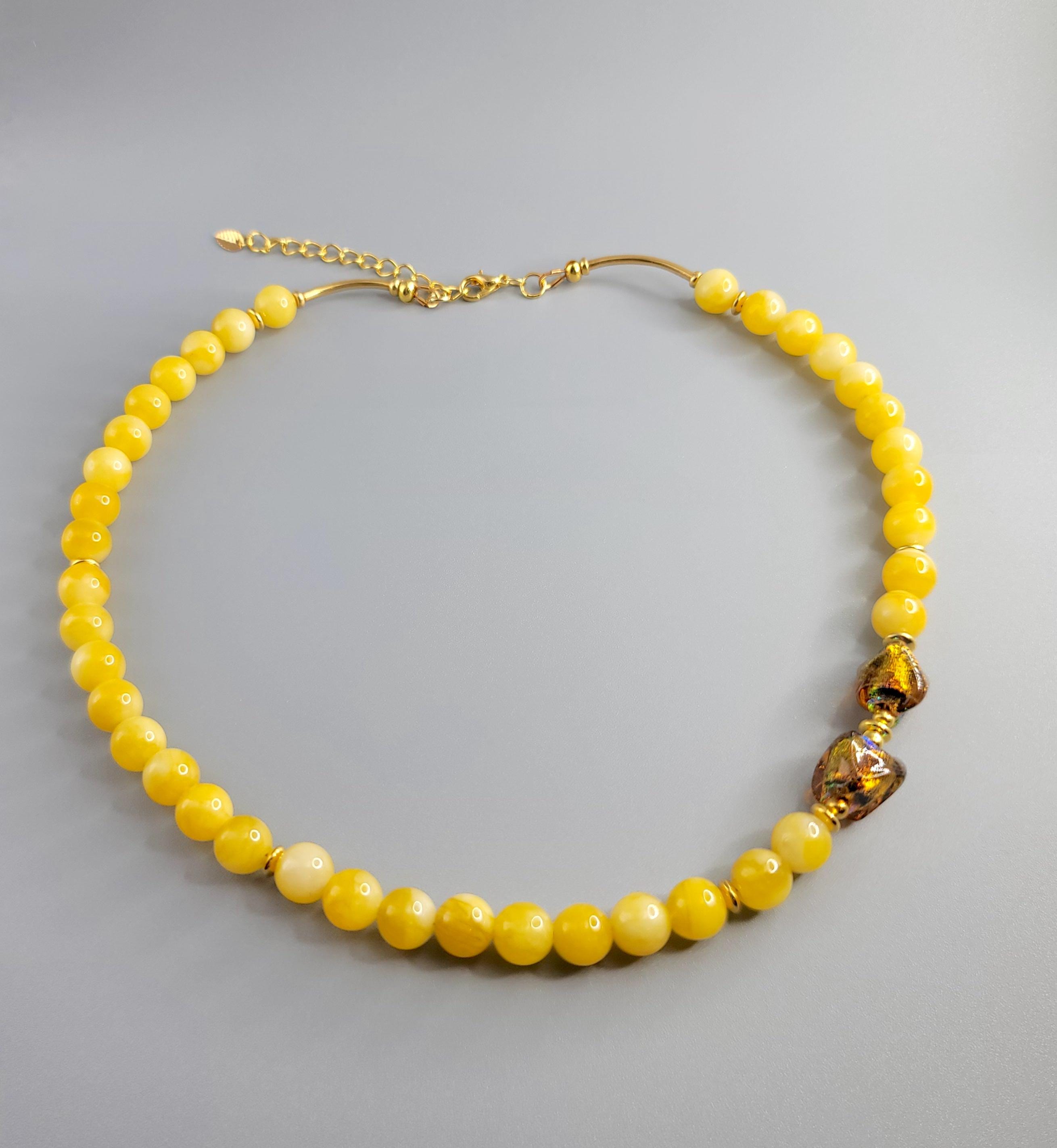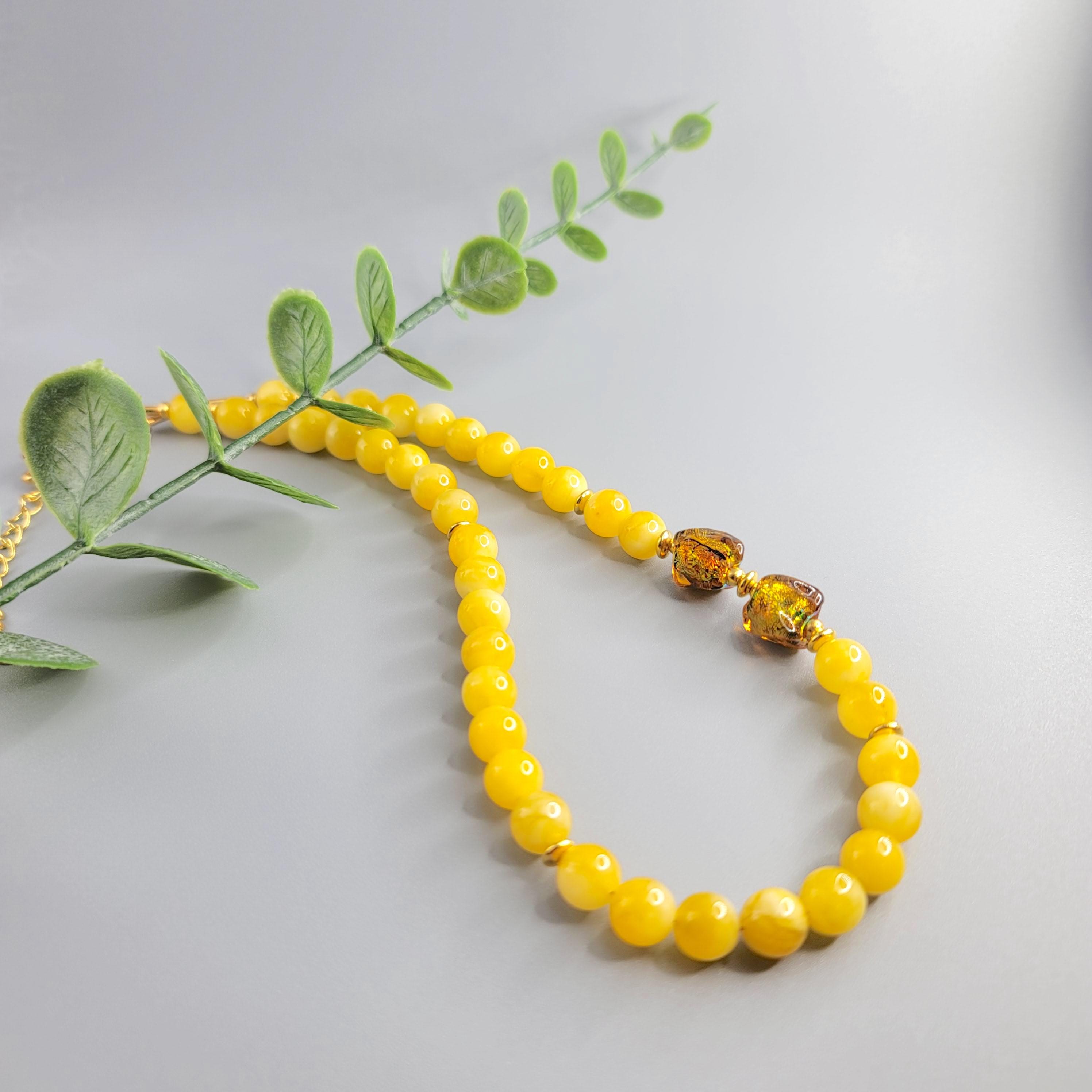 This necklace features Yellow Chalcedony Gemstone beads, Lampwork focal beads and gold plated spacers.