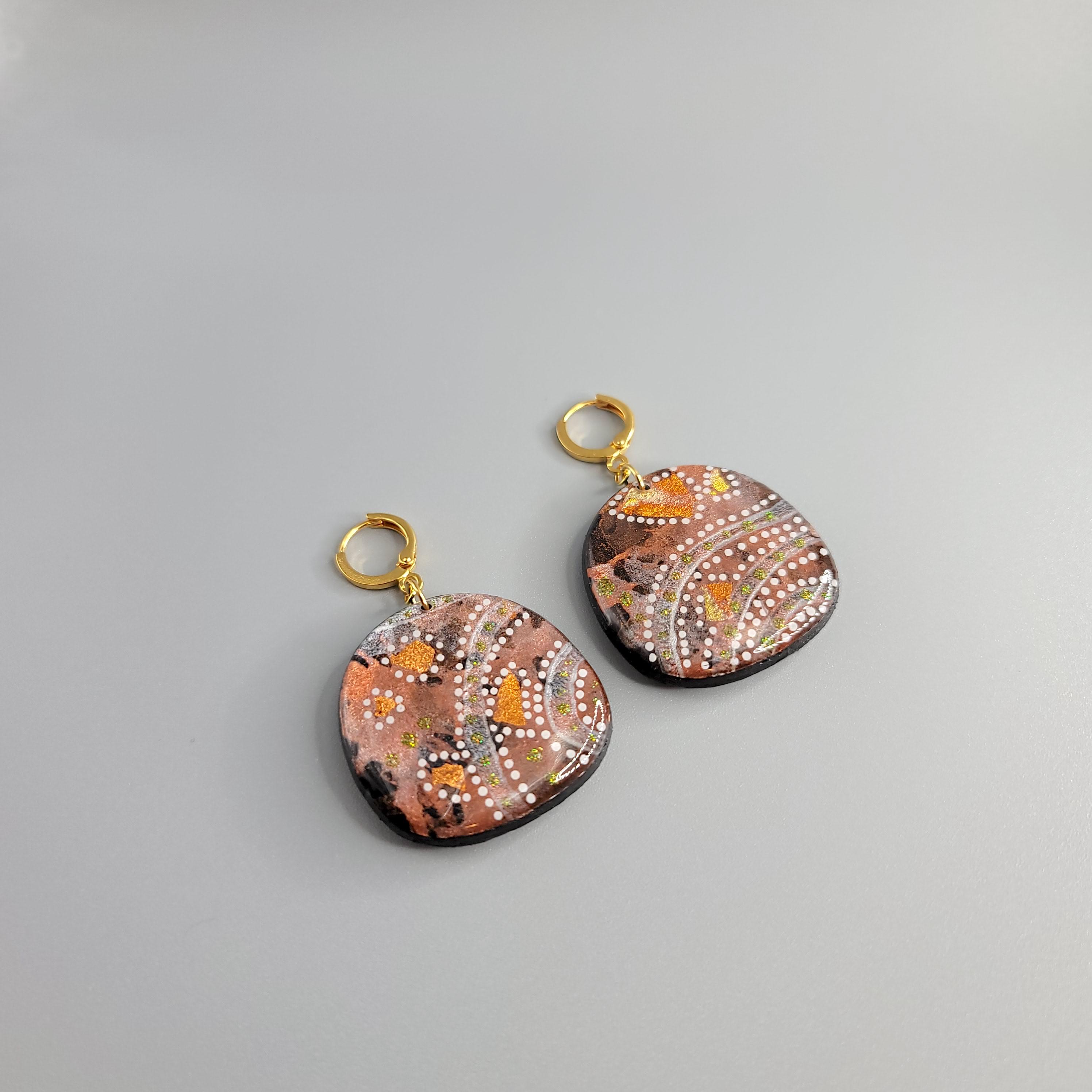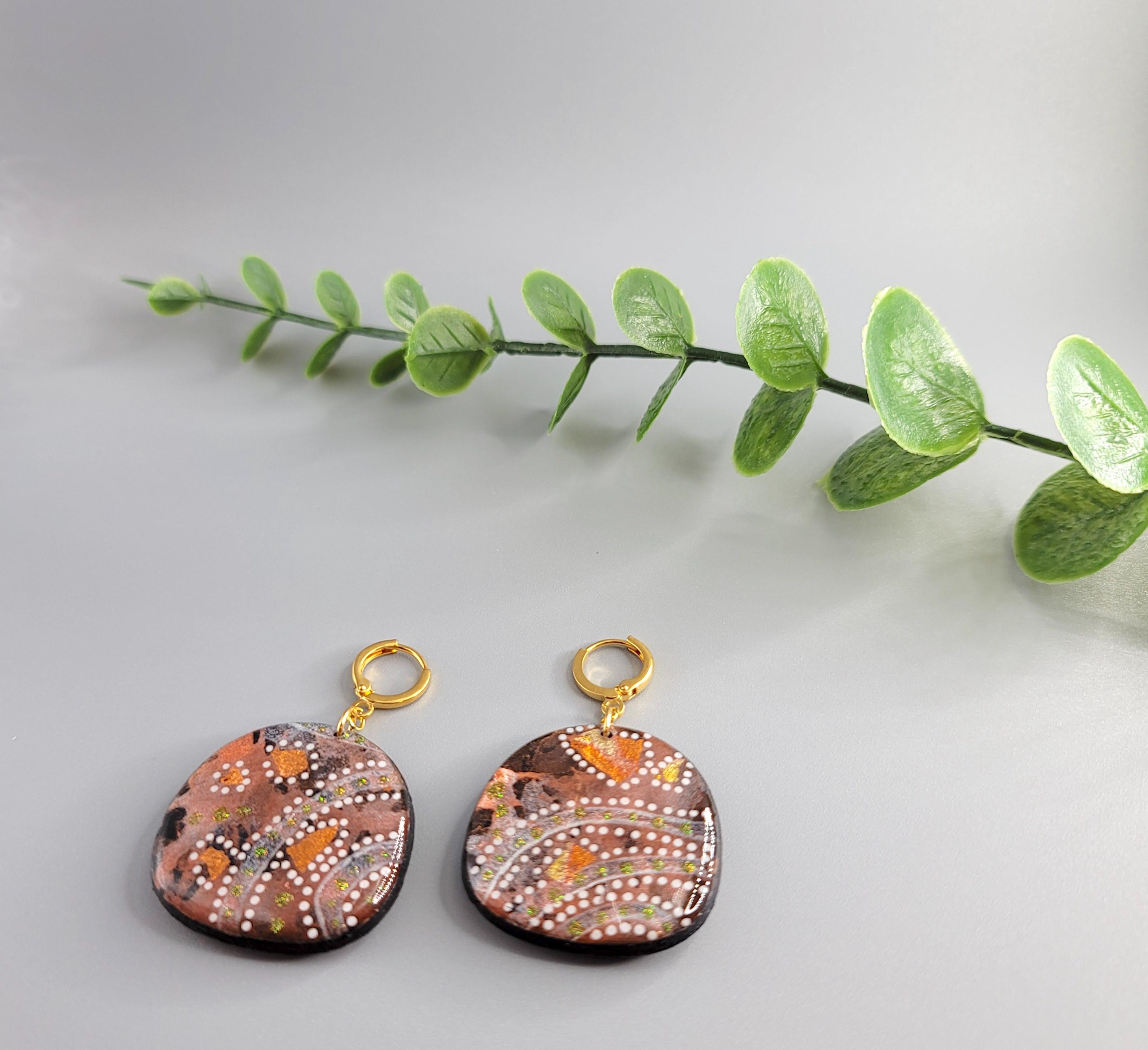 The earrings are crafted using Polymer Clay, metallic foil, alcohol inks and acrylic pait. Both sides of the earrings are coated with UV resin.