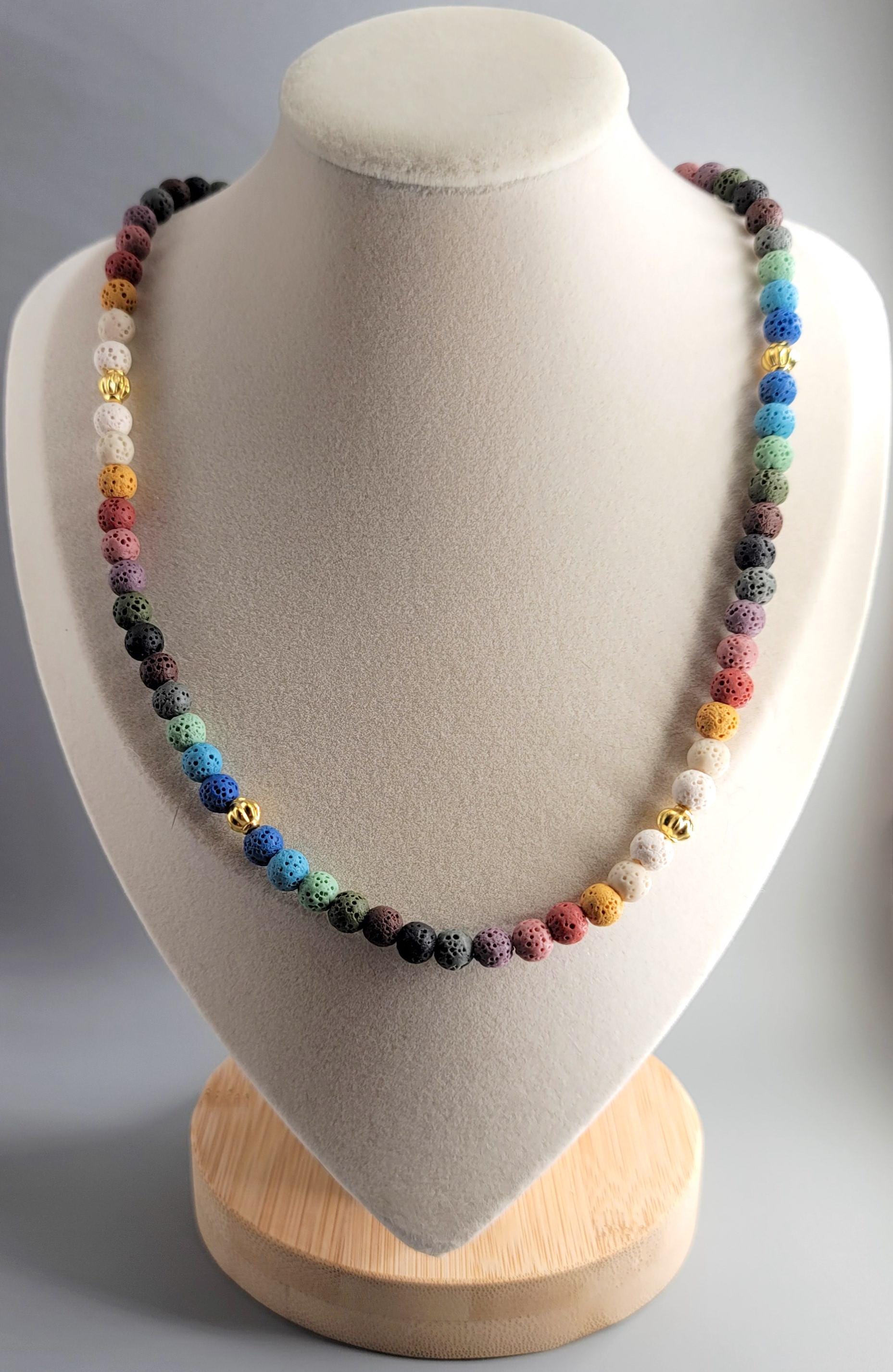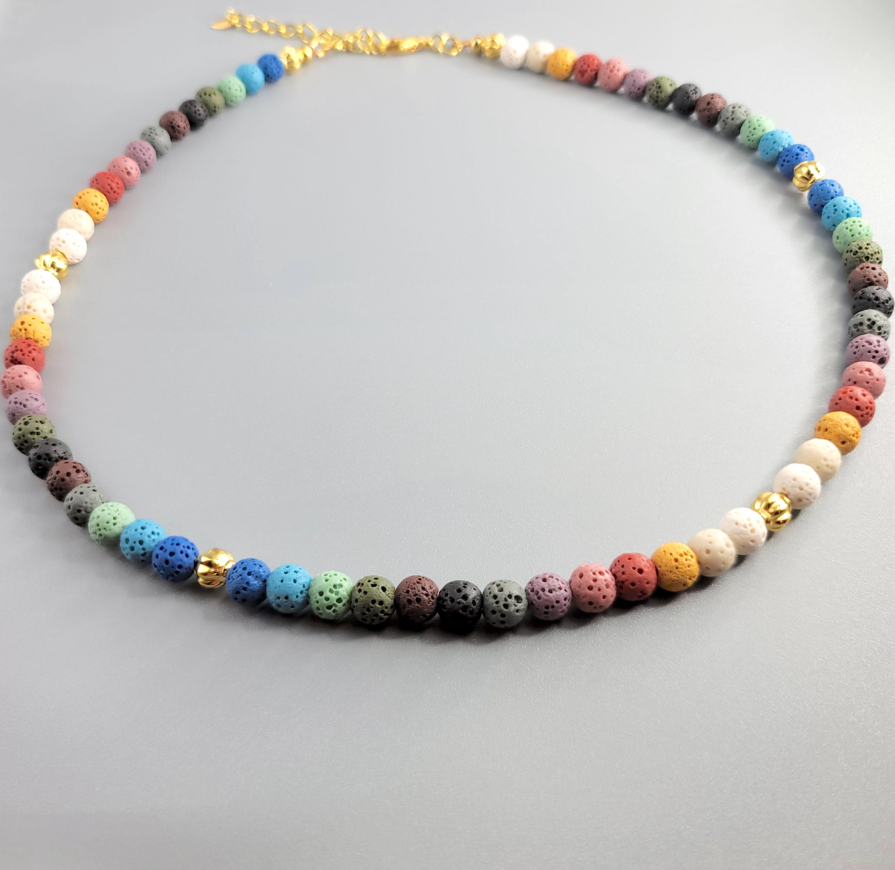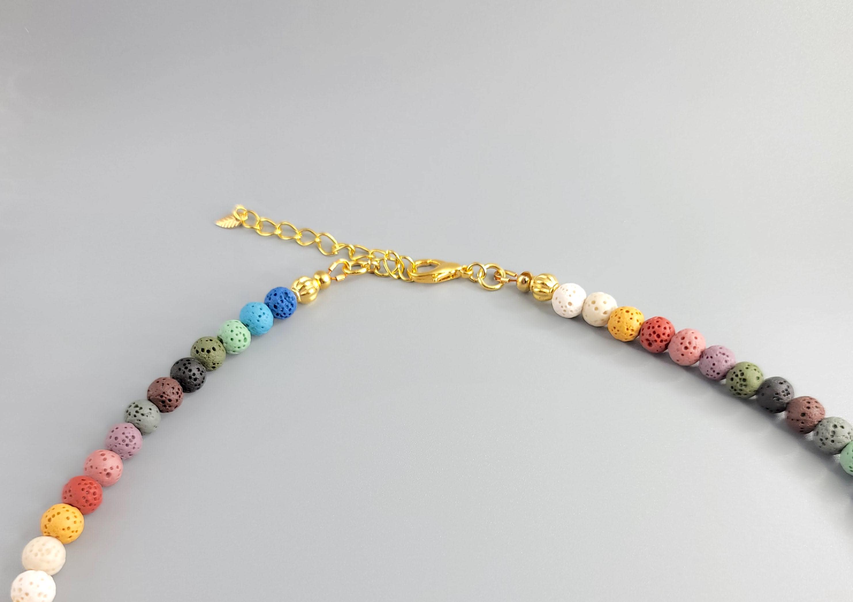 This necklace features Lava Stone beads, gold plated and gold acrylic spacers.