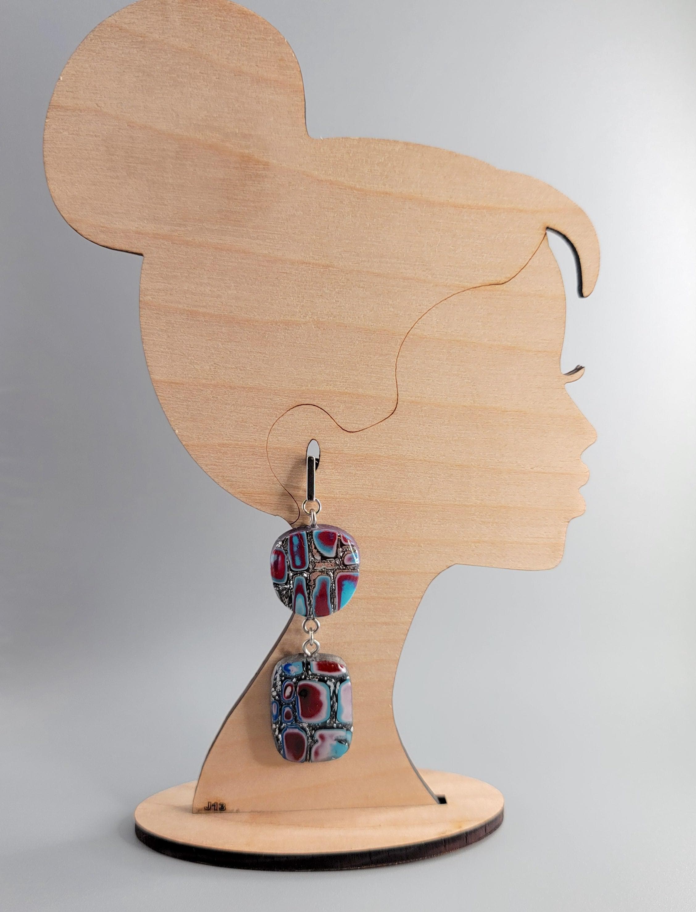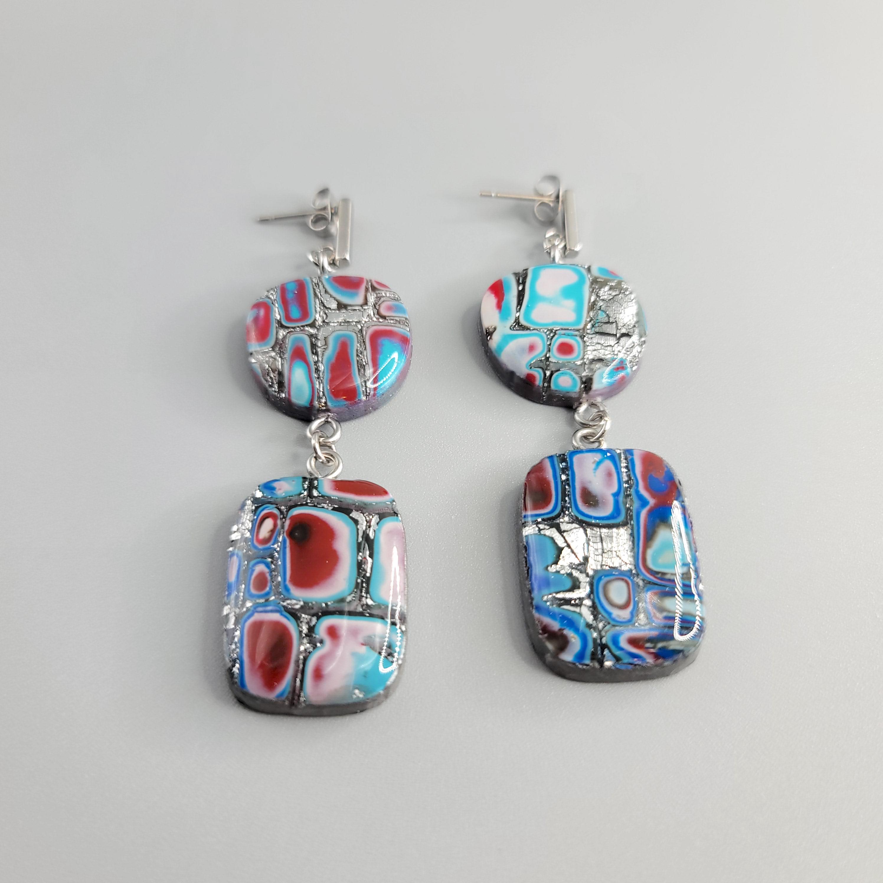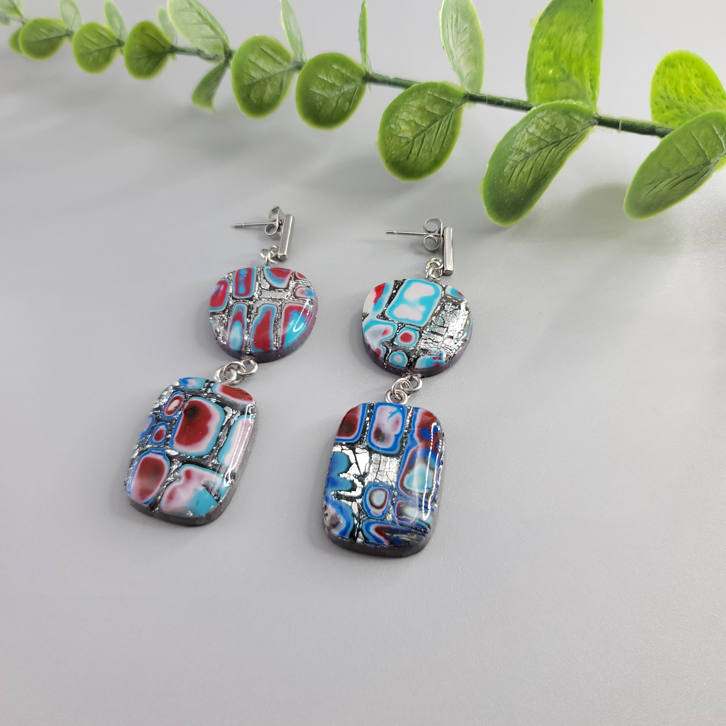 The earrings are crafted using Polymer Clay with with the technique of Mokume Gane. The front side of the earrings is coated with UV resin, and the back and sides are coated with a gloss clear polyurethane.