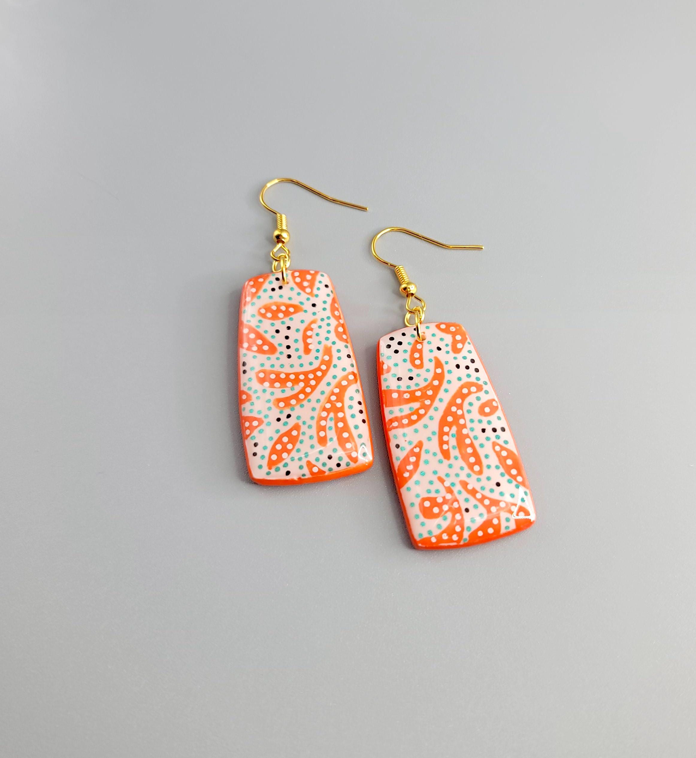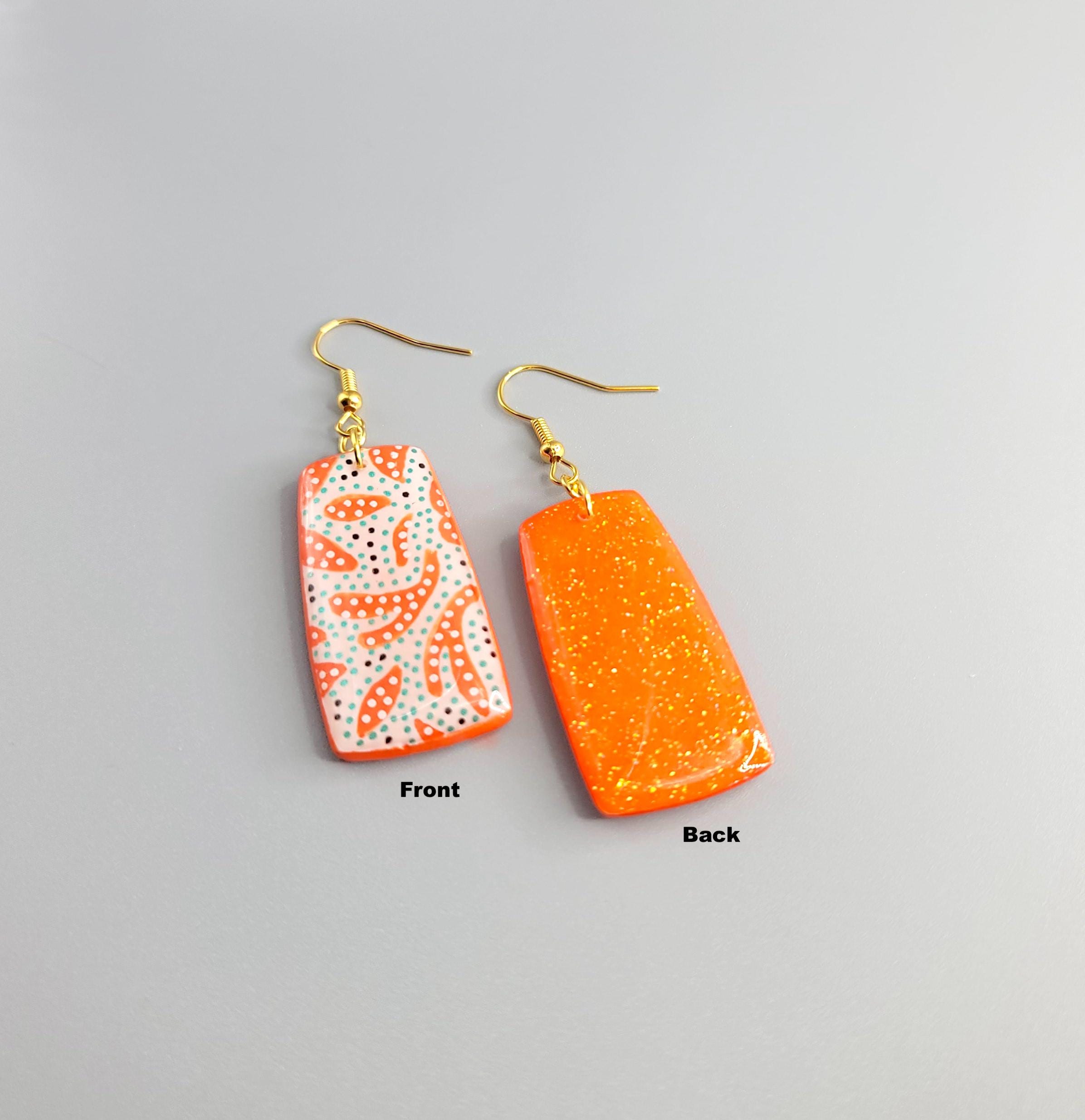 The earrings are crafted using Polymer Clay and hand painted with acrylic paints. The front, the back, and the sides of the earrings are coated with UV resin. Glitter is added to the earrings back finish.