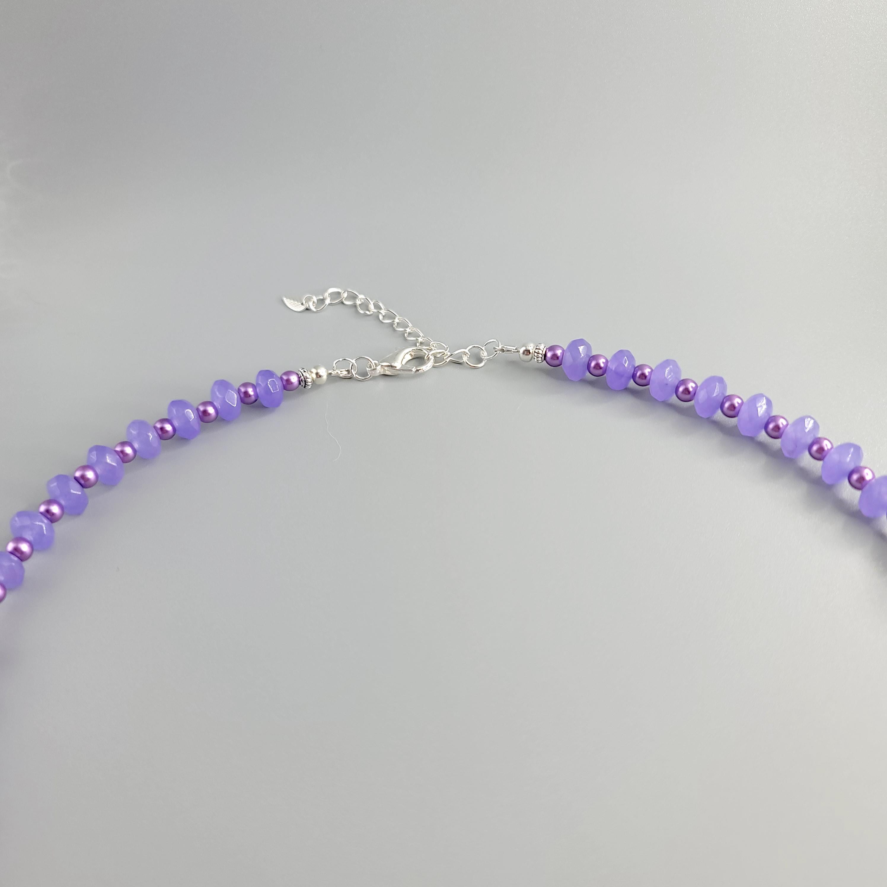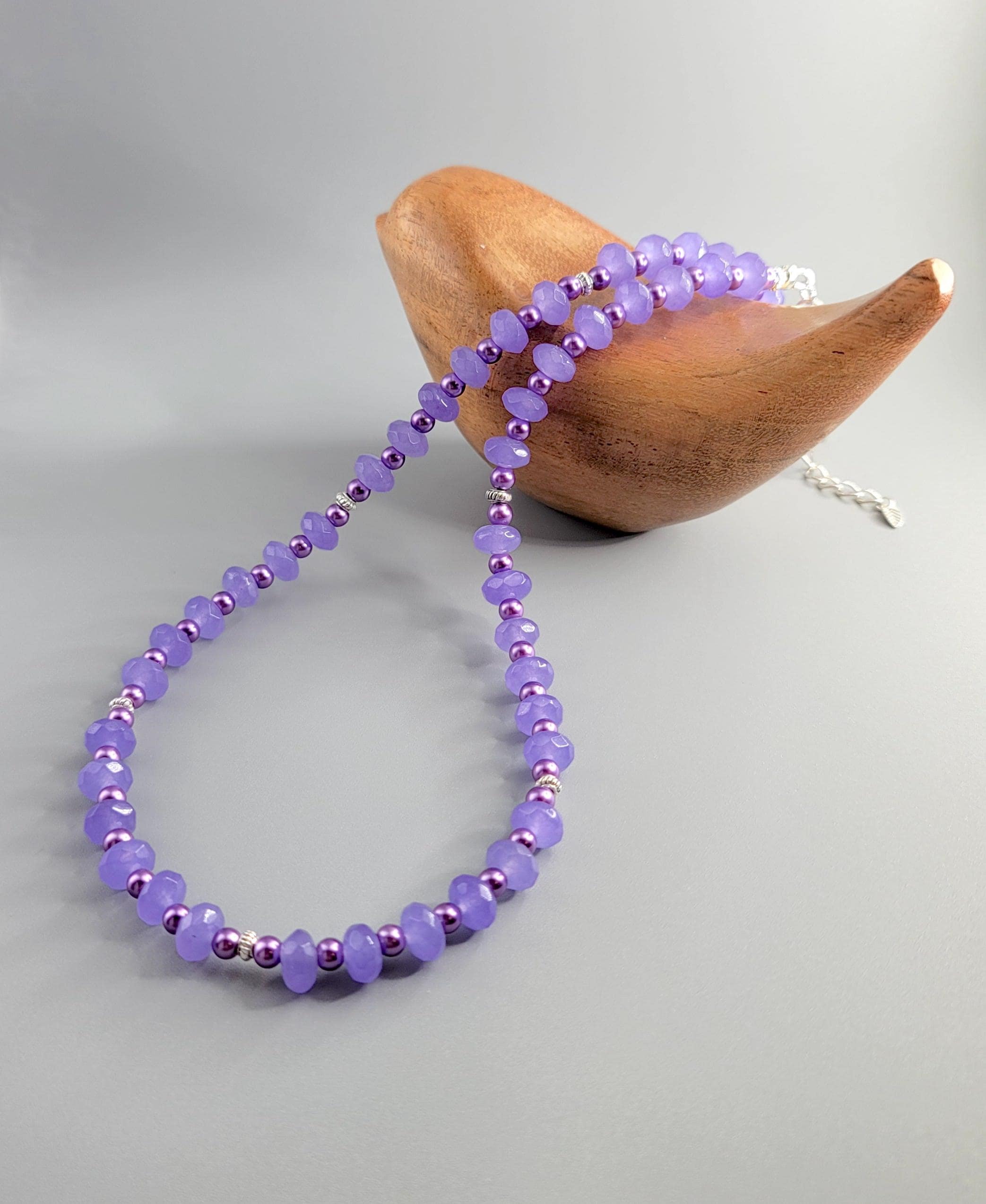 This necklace features an Purple rondelle faceted Amethyst beads, purple glass pearls and antique silver plated spacers.