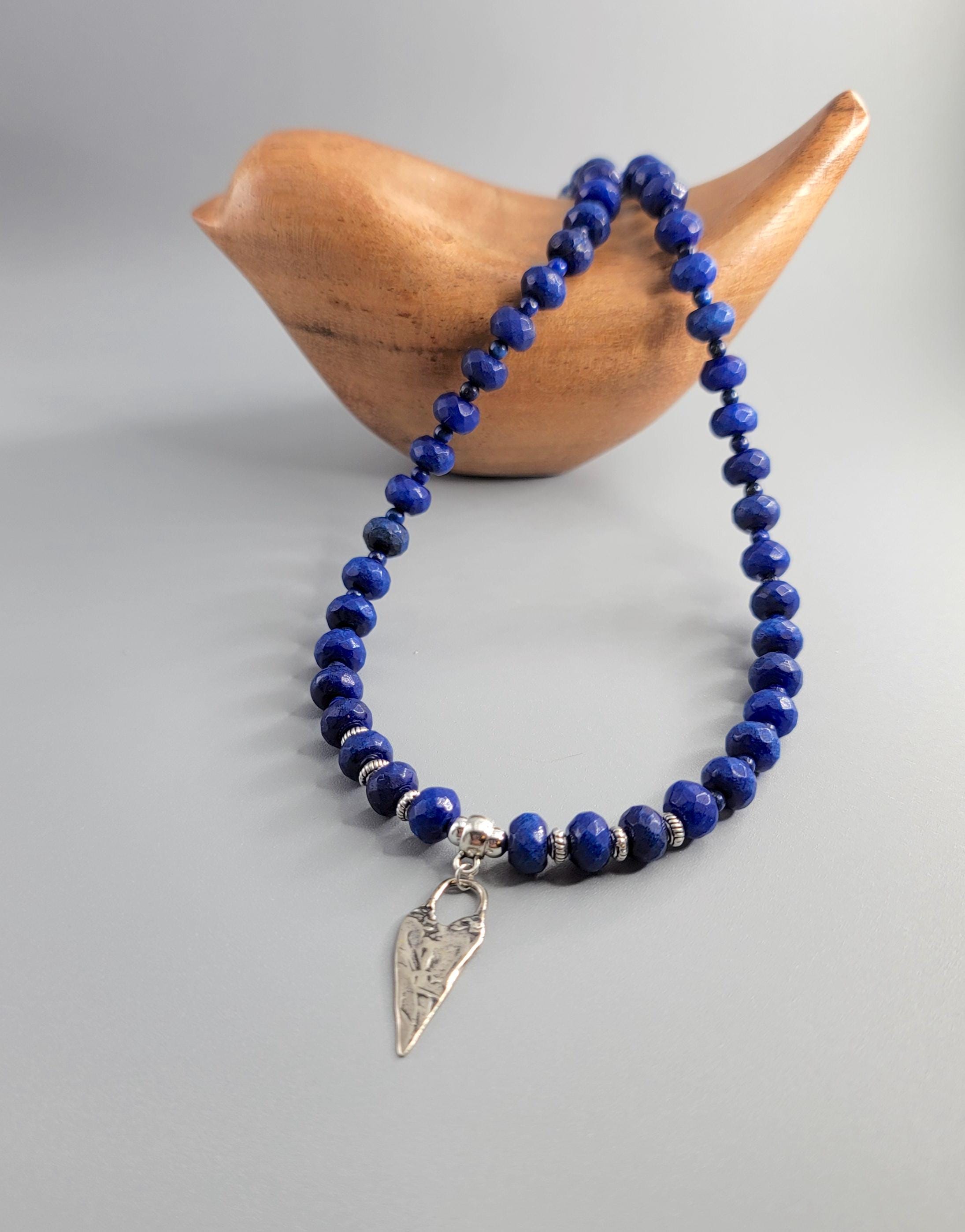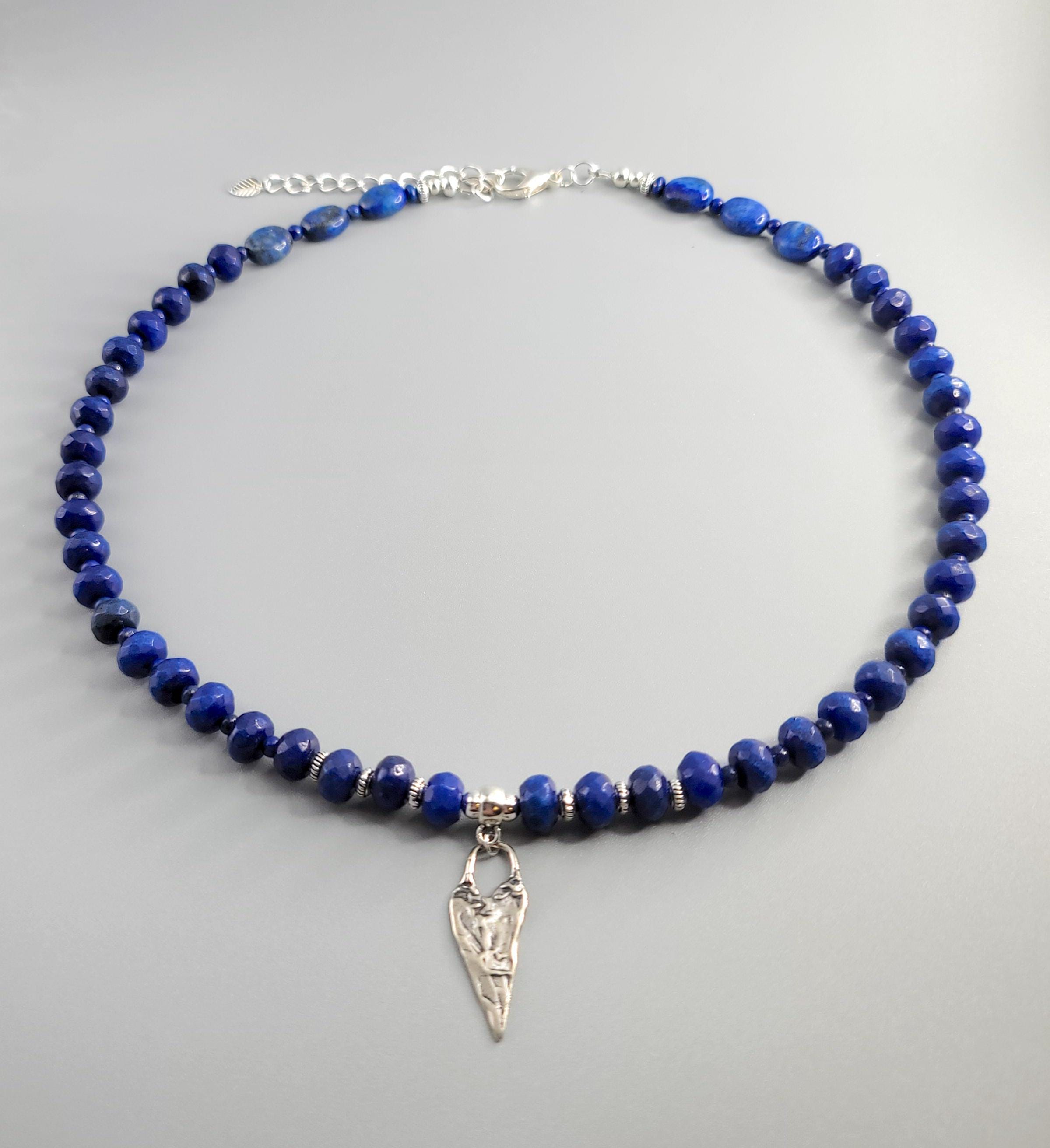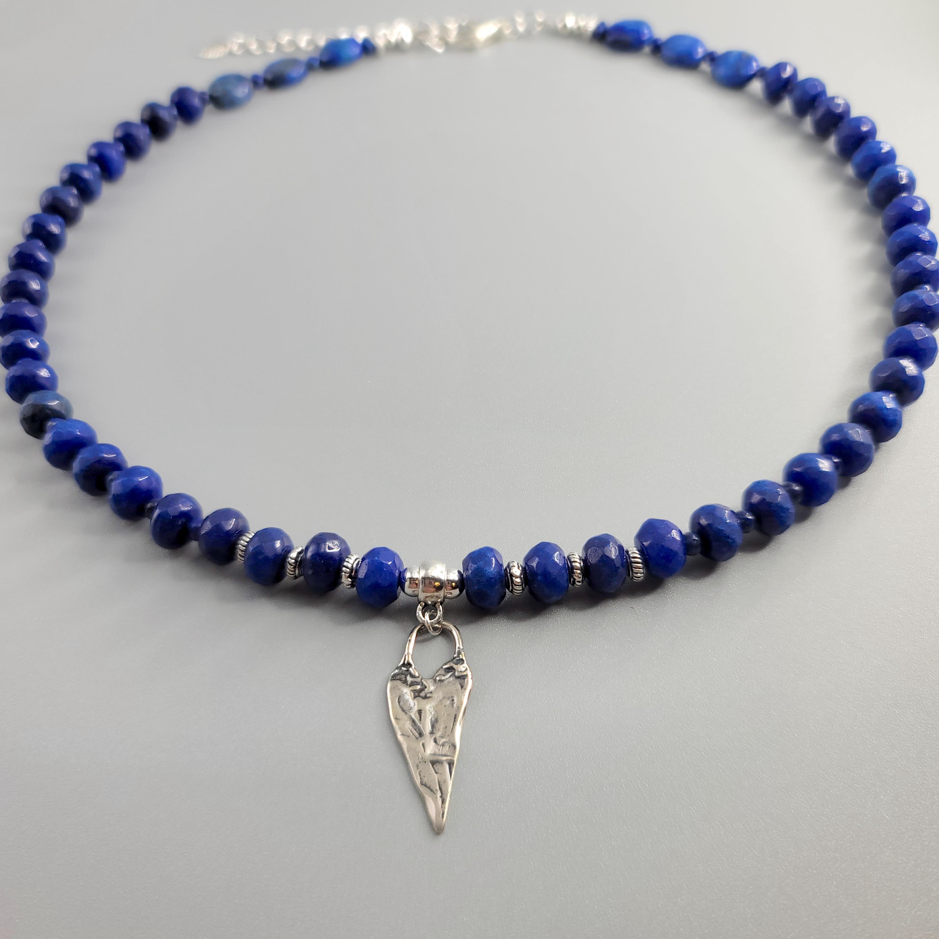 This necklace features Lapiz Lazuli beads in different sizes and shapes, and hammered silver heart pendant.