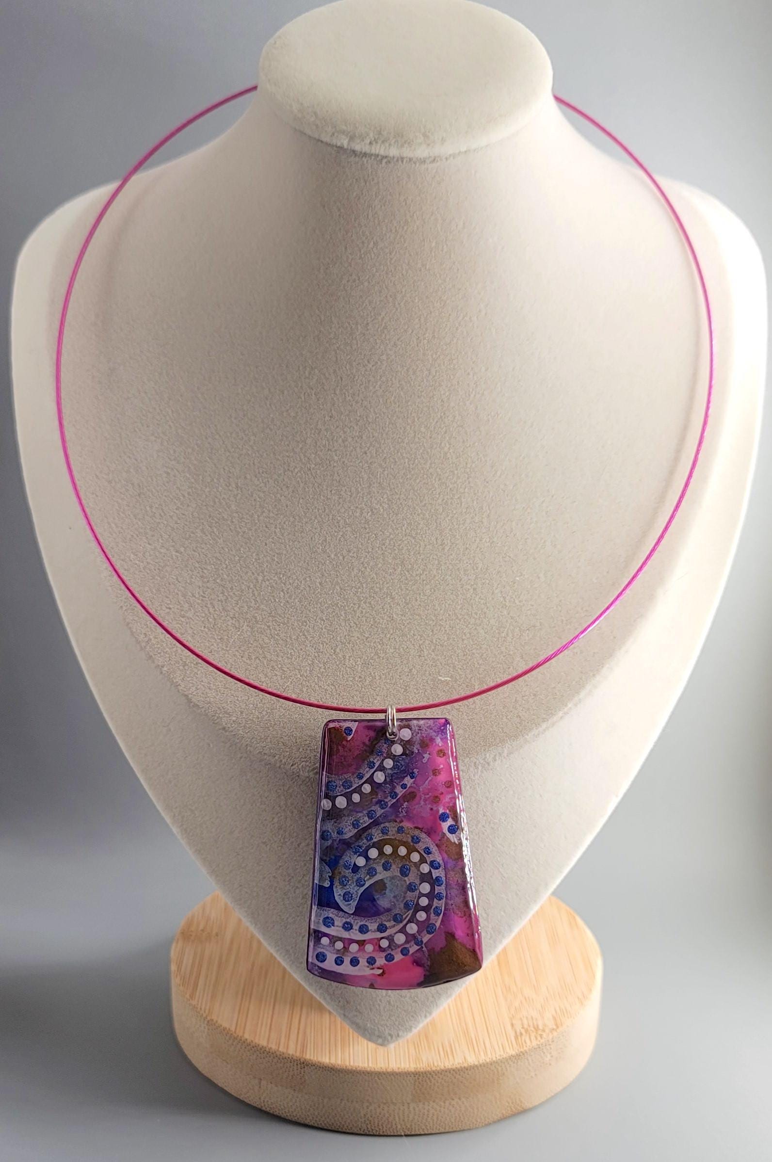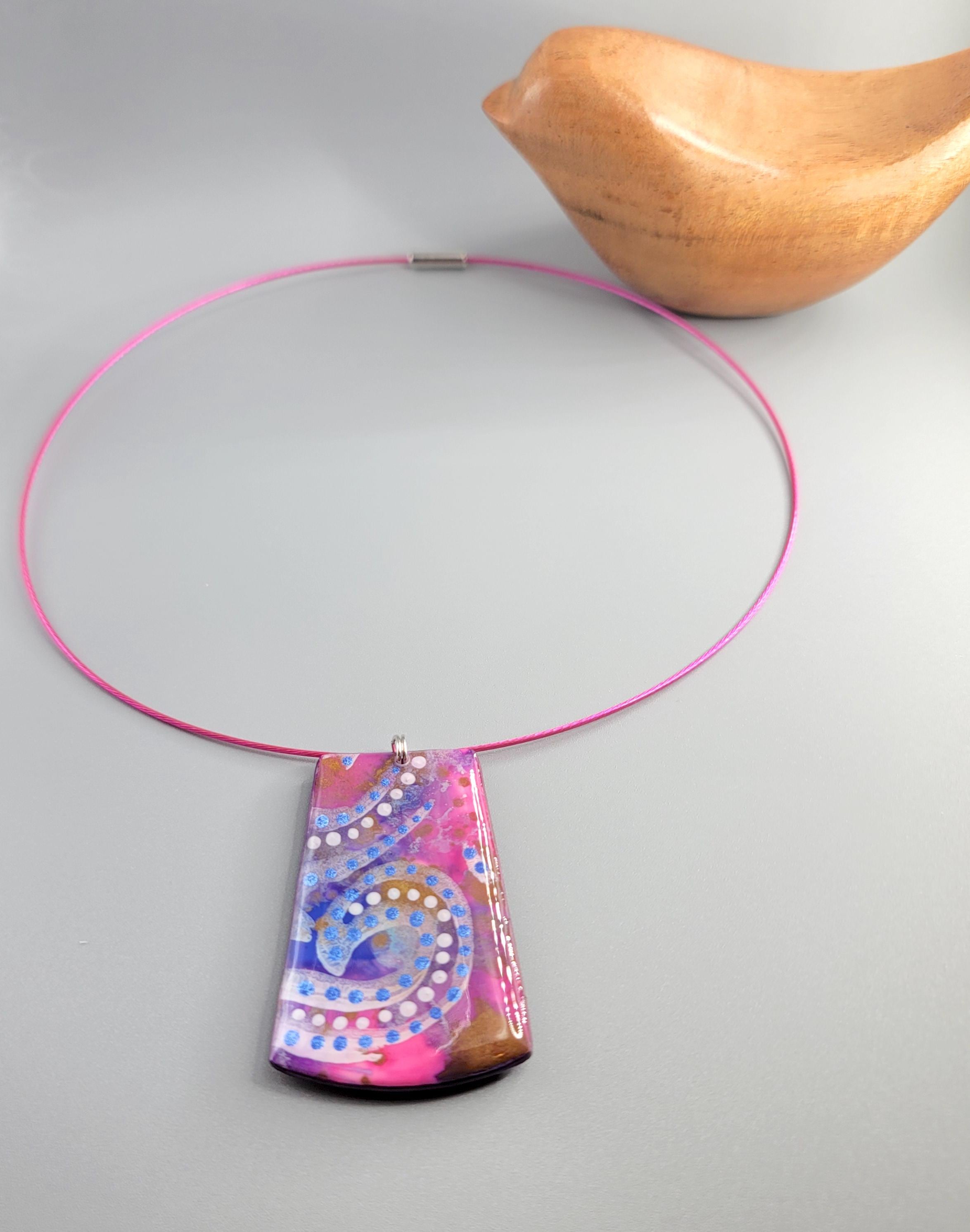 The pendant is crafted using Polymer Clay, alcohol inks, acrylic and metallic paint. The front, back and side are coated with UV resin.