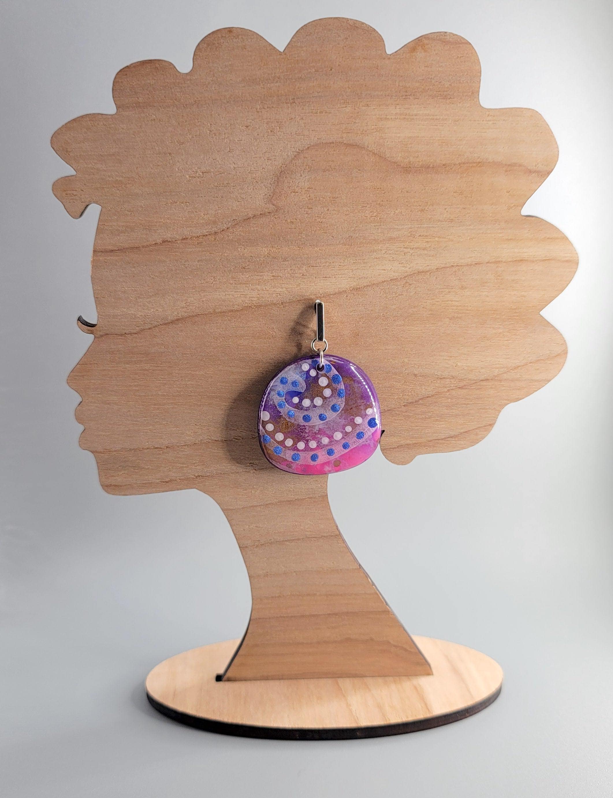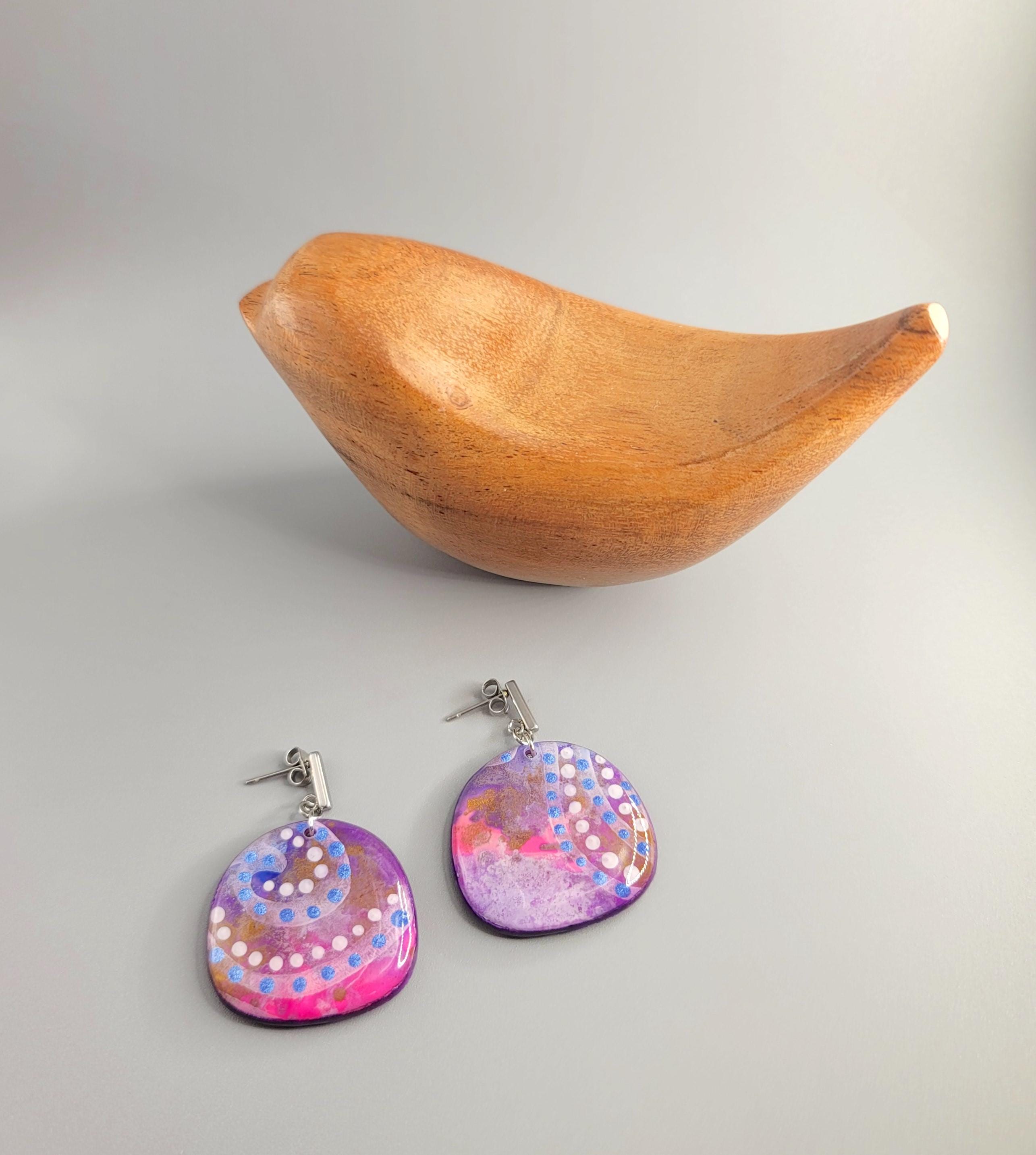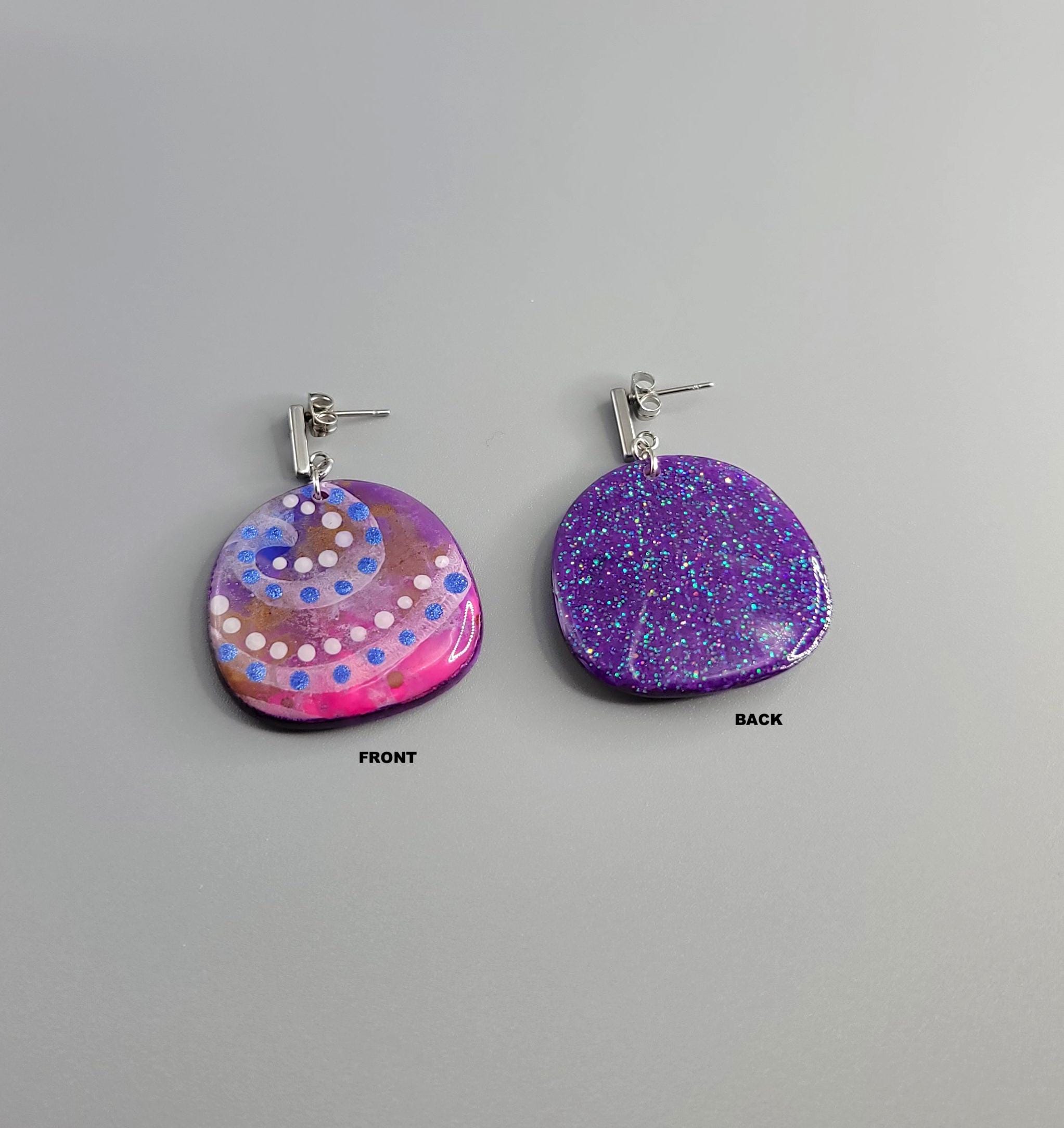 The earrings are crafted using Polymer Clay, and alcohol inks. They are hand painted, and the front, back and side of the earrings are coated with UV resin. Glitter was applied to the back.