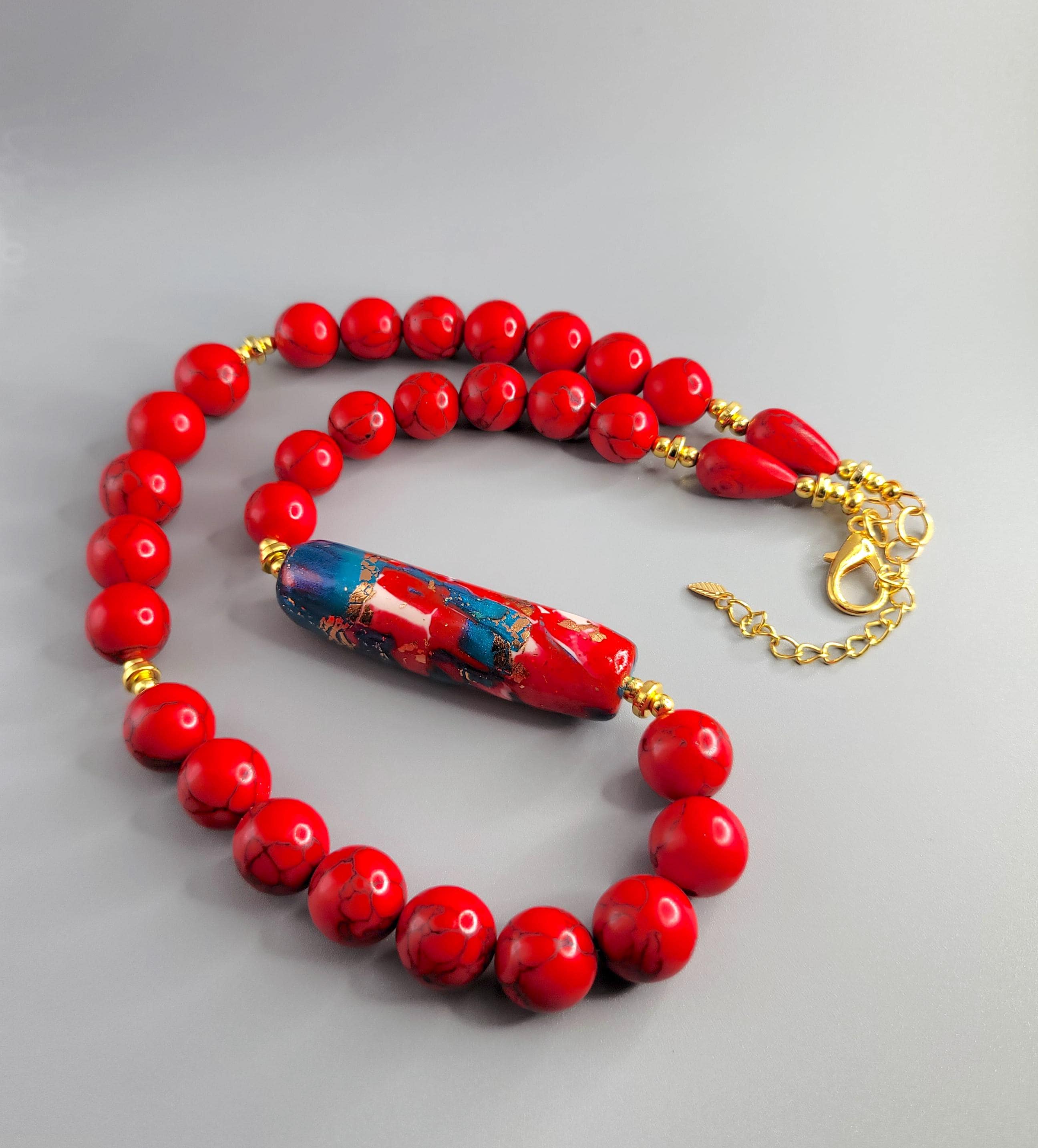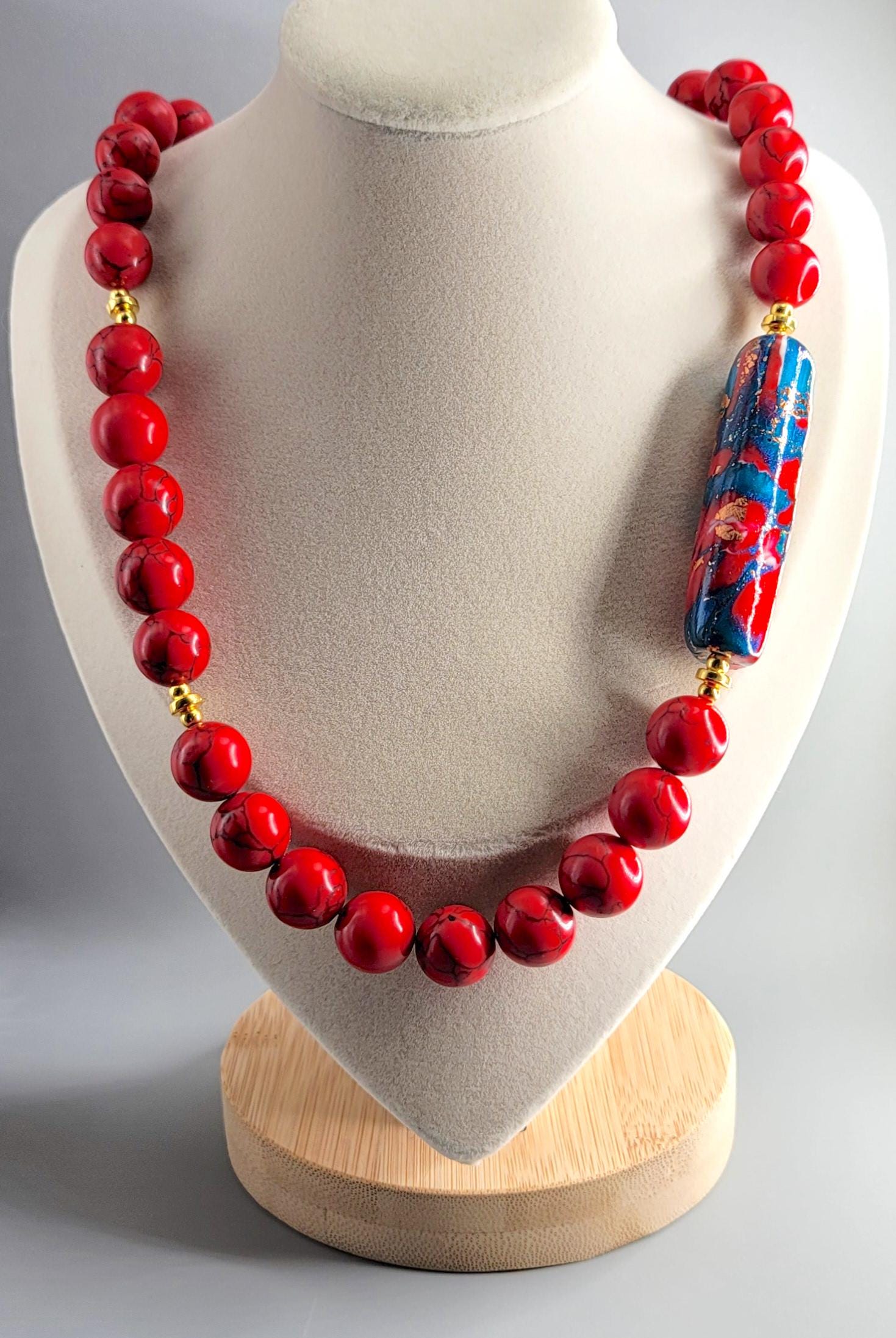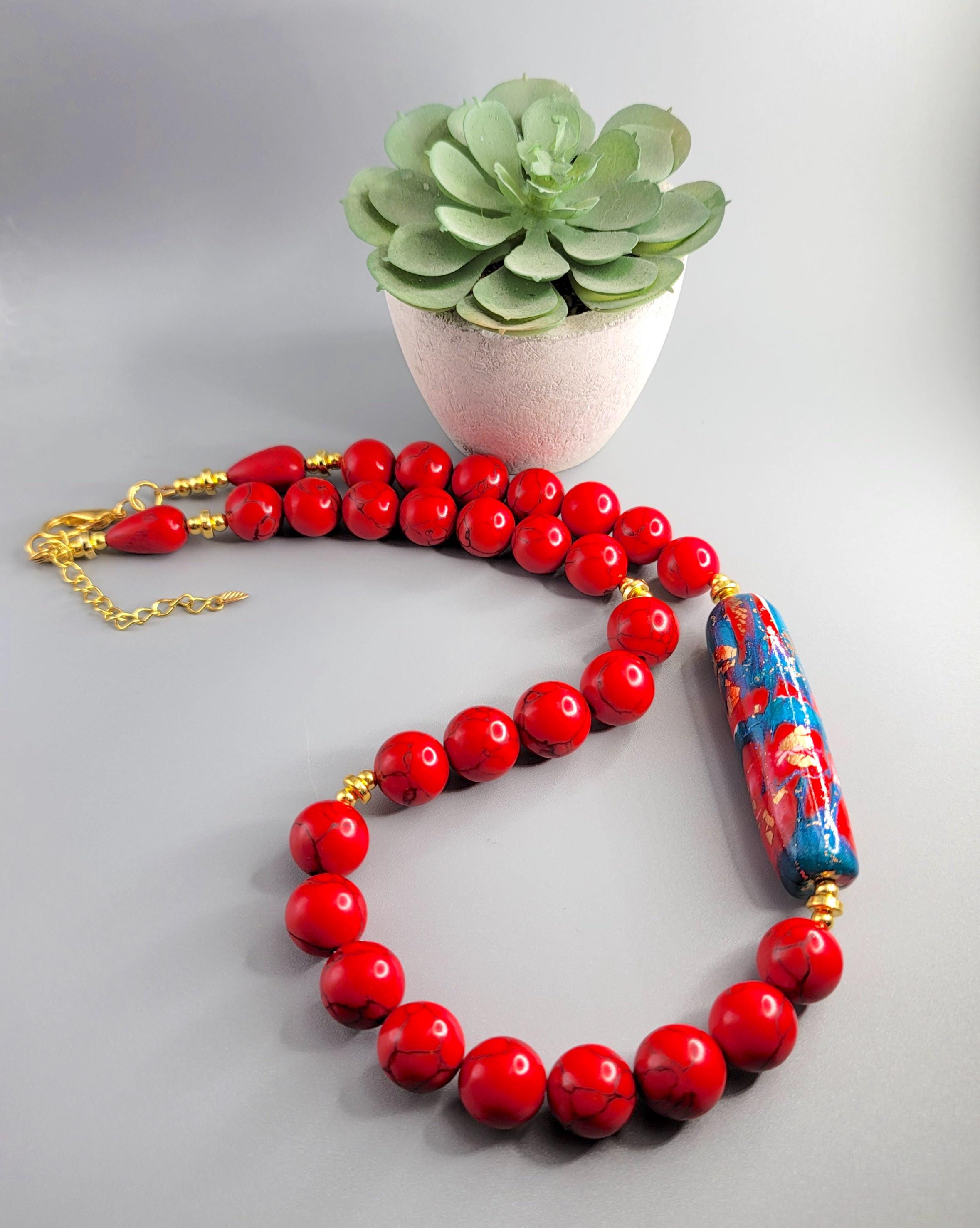 This necklace features a polymer clay focal bead, red agate barrel beads, and gold plated spacers.
